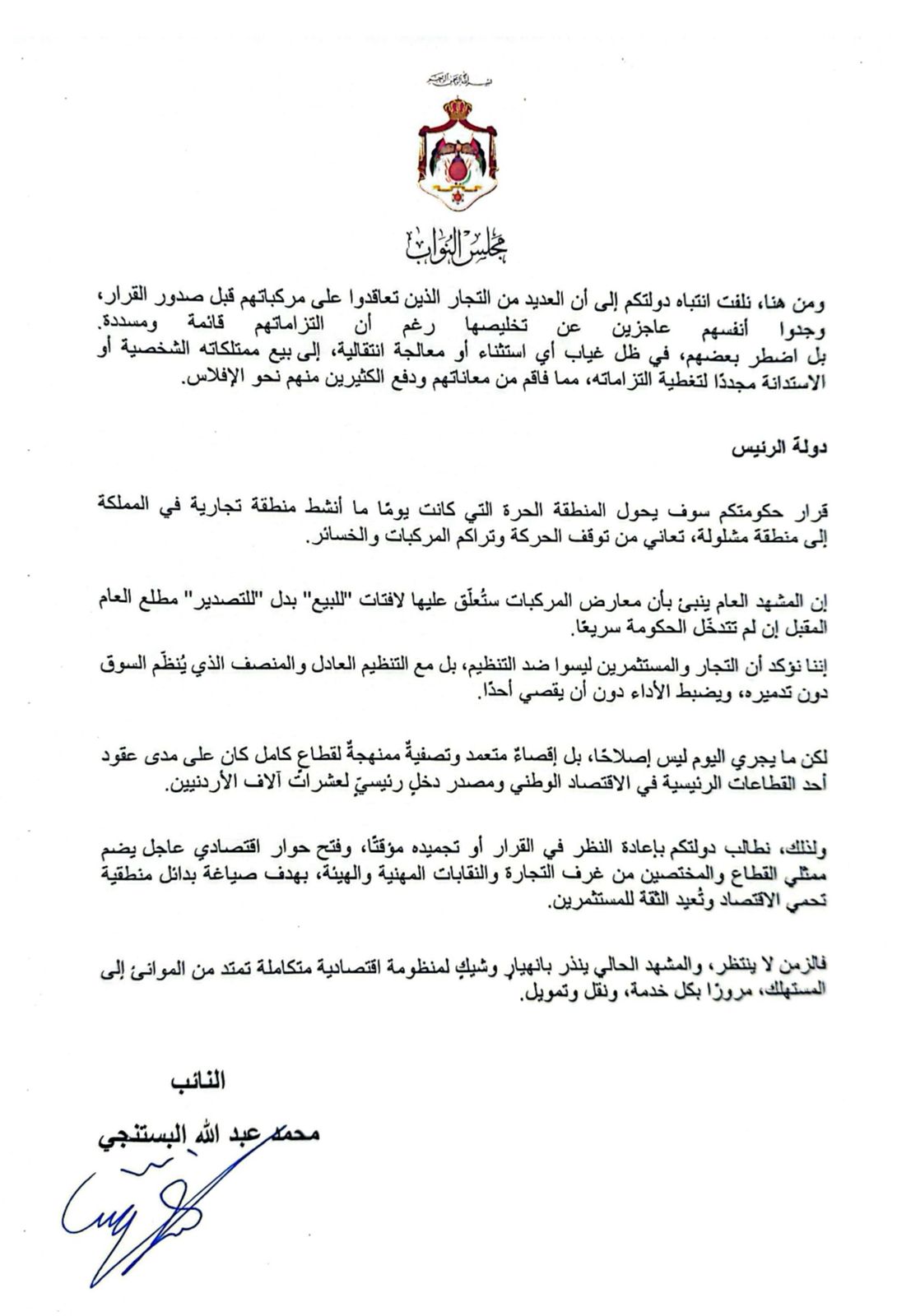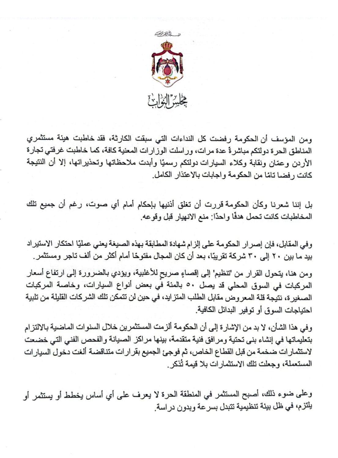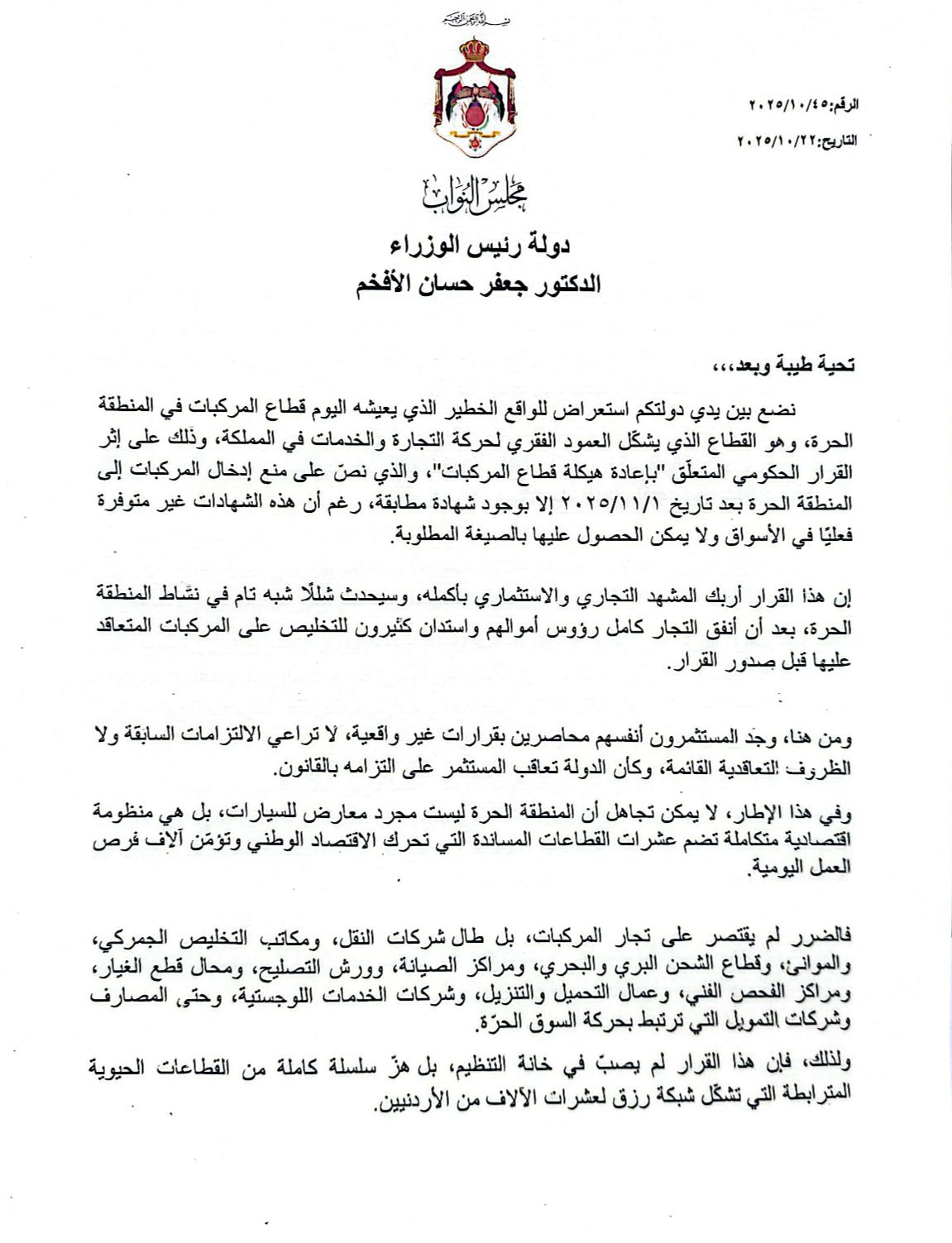وقال النائب البستنجي، بحسب المذكرة، إن القرار فُرض دون دراسة واقعية كافية، فشهادات المطابقة المطلوبة غير متوفرة في ويستحيل إصدارها، مضيفًا أن القرار "سيغلق فعليًا أبواب المنطقة الحرة أمام حركة المركبات والنشاط التجاري.
