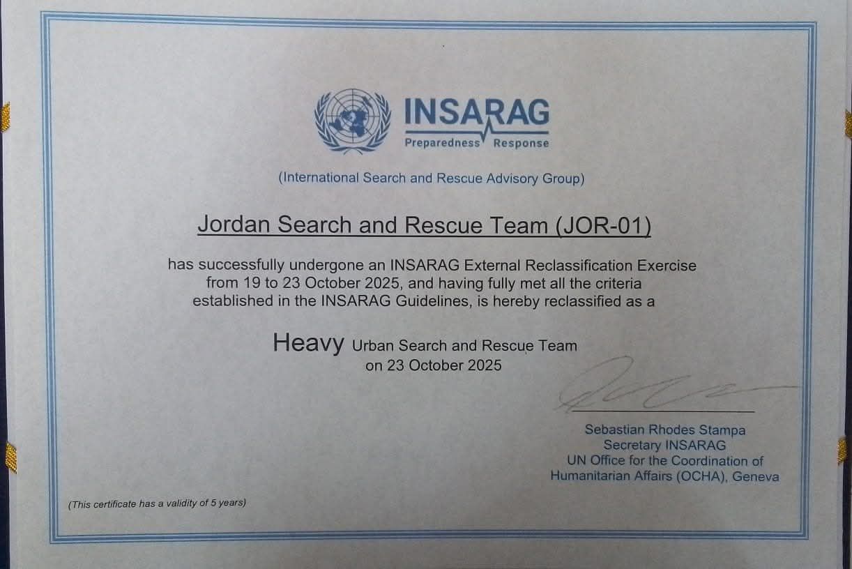 نجح فريق البحث والإنقاذ الأردني الدولي التابع لمديرية الأمن العام/الدفاع المدني في الحفاظ على تصنيفه الدولي "الثقيل" ضمن فرق البحث والإنقاذ العالمية، بعد اجتيازه باقتدار عملية إعادة التقييم التي أجرتها الهيئة الدولية الاستشارية لفرق البحث والإنقاذ (INSARAG) التابعة للأمم المتحدة.