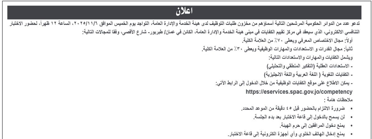 دعت عدة دوائر حكومية أردنية اليوم الثلاثاء، عددًا كبيرًا من المرشحين المدرجة أسماؤهم إلى حضور الاختبار التنافسي تمهيدًا لاستكمال إجراءات التعيين في مؤسسات الدولة المختلفة.