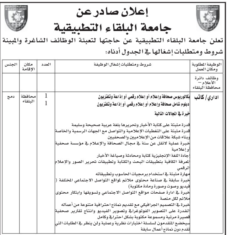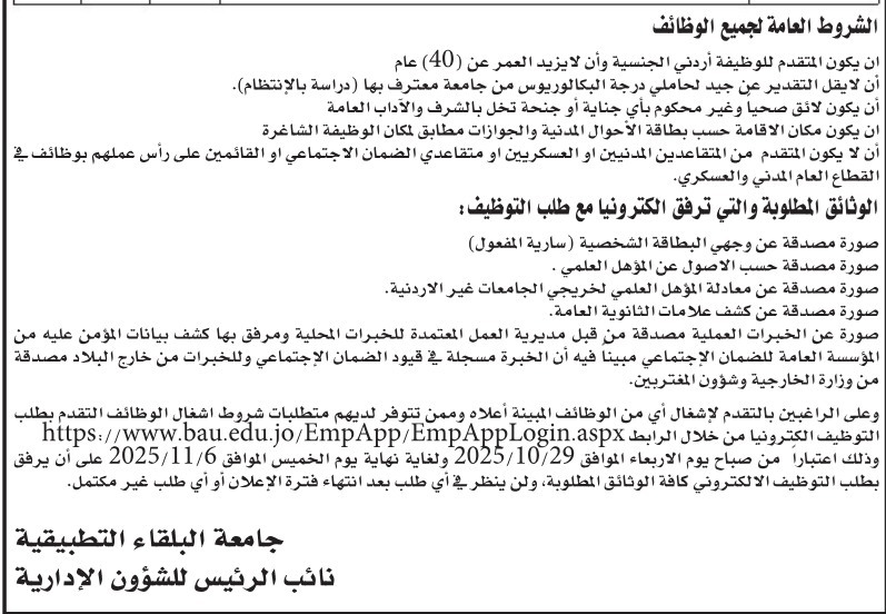 أعلنت عدد من الجامعات الحكومية الأردنية اليوم الأربعاء، عن توفّر وظائف شاغرة، وذلك ضمن إجراءاتها لتعبئة الشواغر.