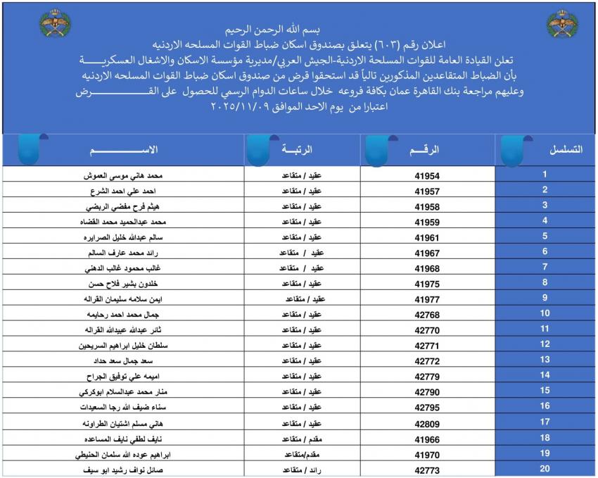 أعلنت القيادة العامة للقوات المسلحة الأردنية – الجيش العربي/ مديرية مؤسسة الإسكان والأشغال العسكرية عن أسماء الضباط وضباط الصف والأفراد المستحقين لـ قرض الإسكان العسكري (للأفراد)، إلى جانب الضباط المستفيدين من صندوق إسكان الضباط للدفعة الحالية.