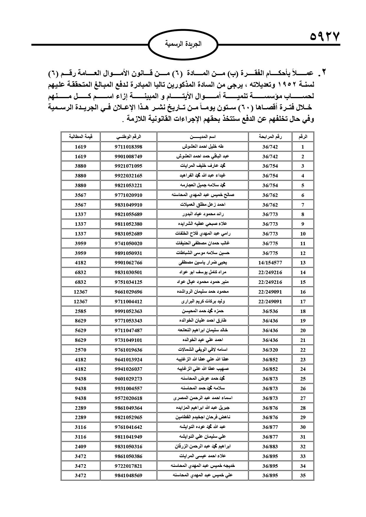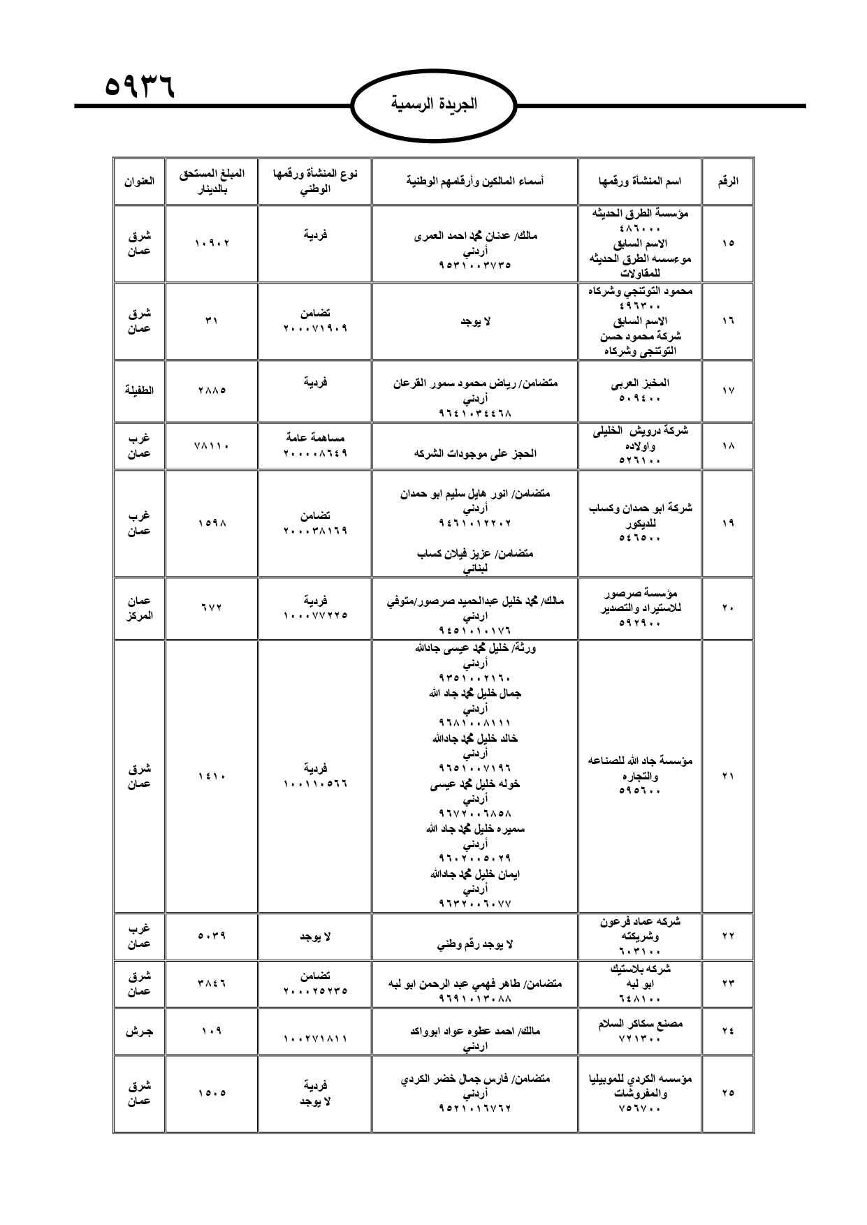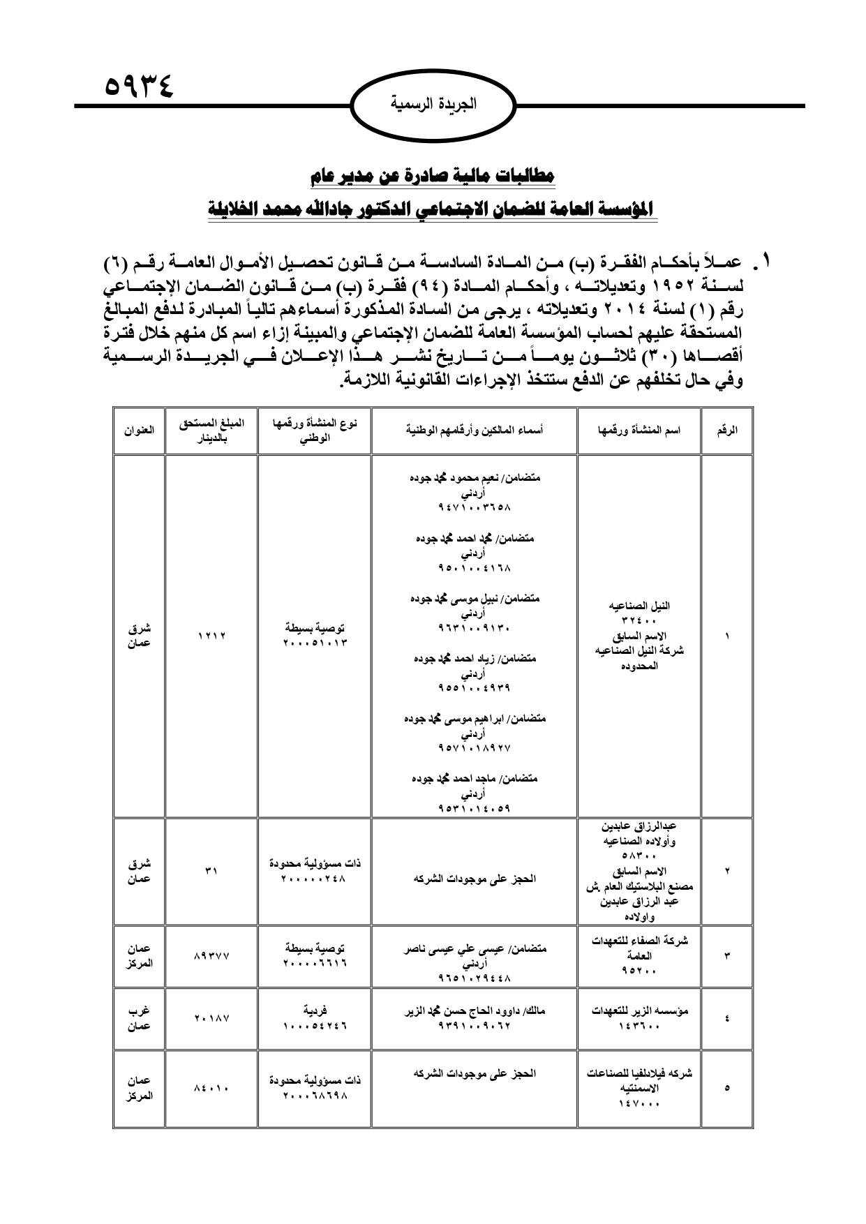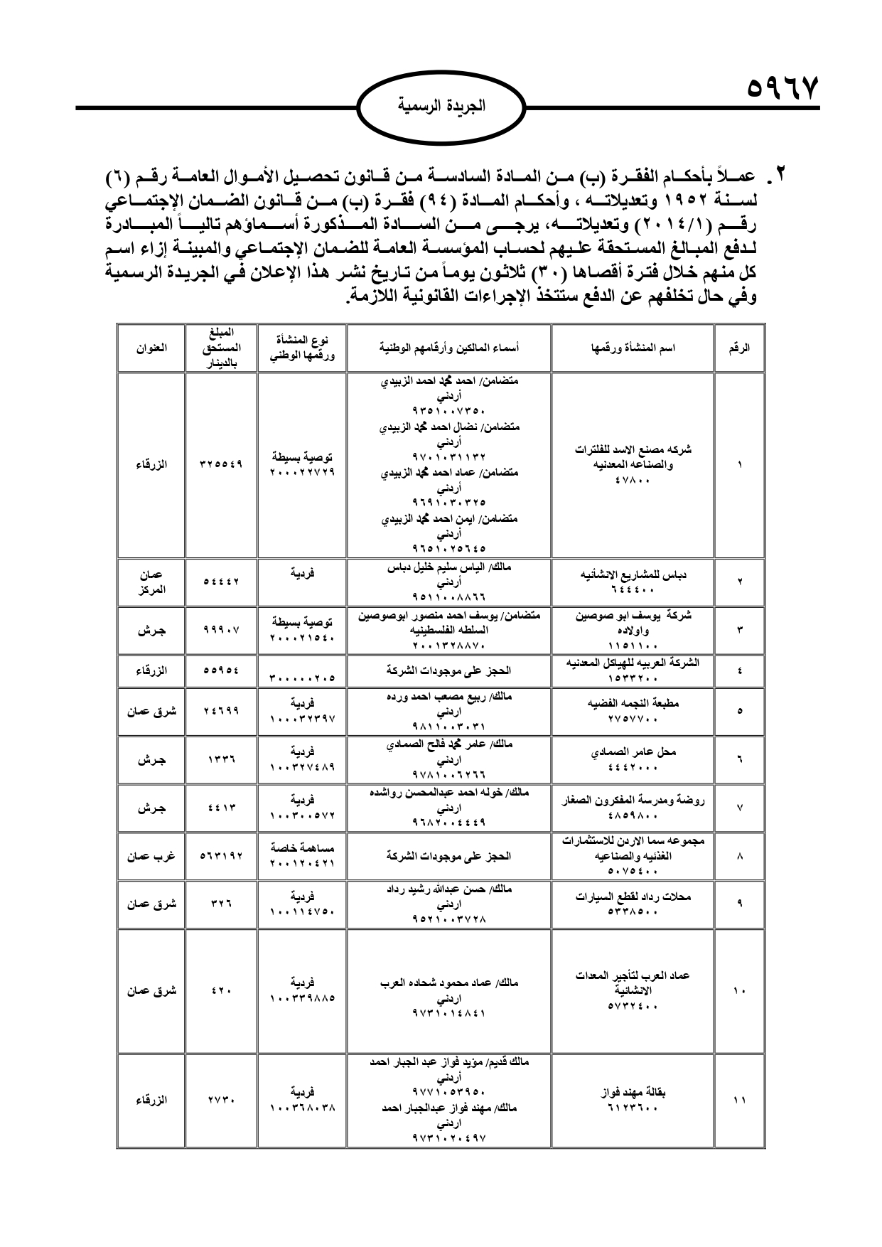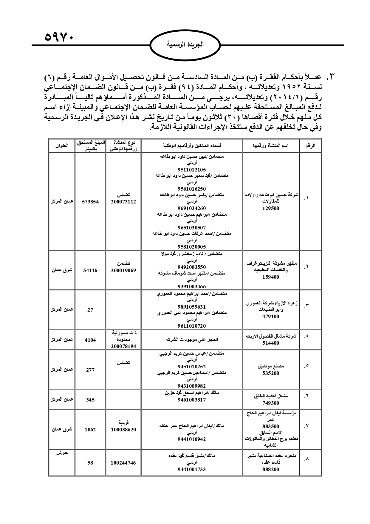 نشرت الجريدة الرسمية في عددها الصادر يوم أمس الخميس، قائمة تضم آلاف الأردنيين المترتبة بحقهم مبالغ مالية لصالح المؤسسة العامة للضمان الاجتماعي ومؤسسة تنمية أموال الأيتام، في خطوة تأتي ضمن الإجراءات القانونية لتحصيل المستحقات المالية المتأخرة.