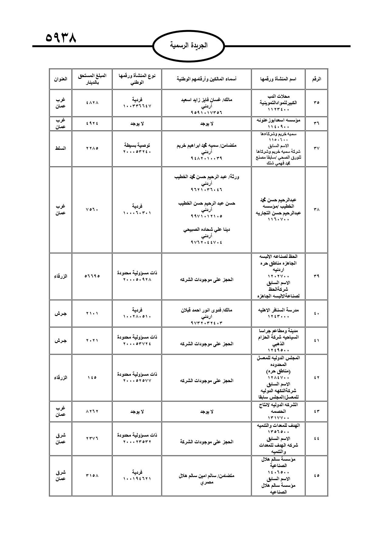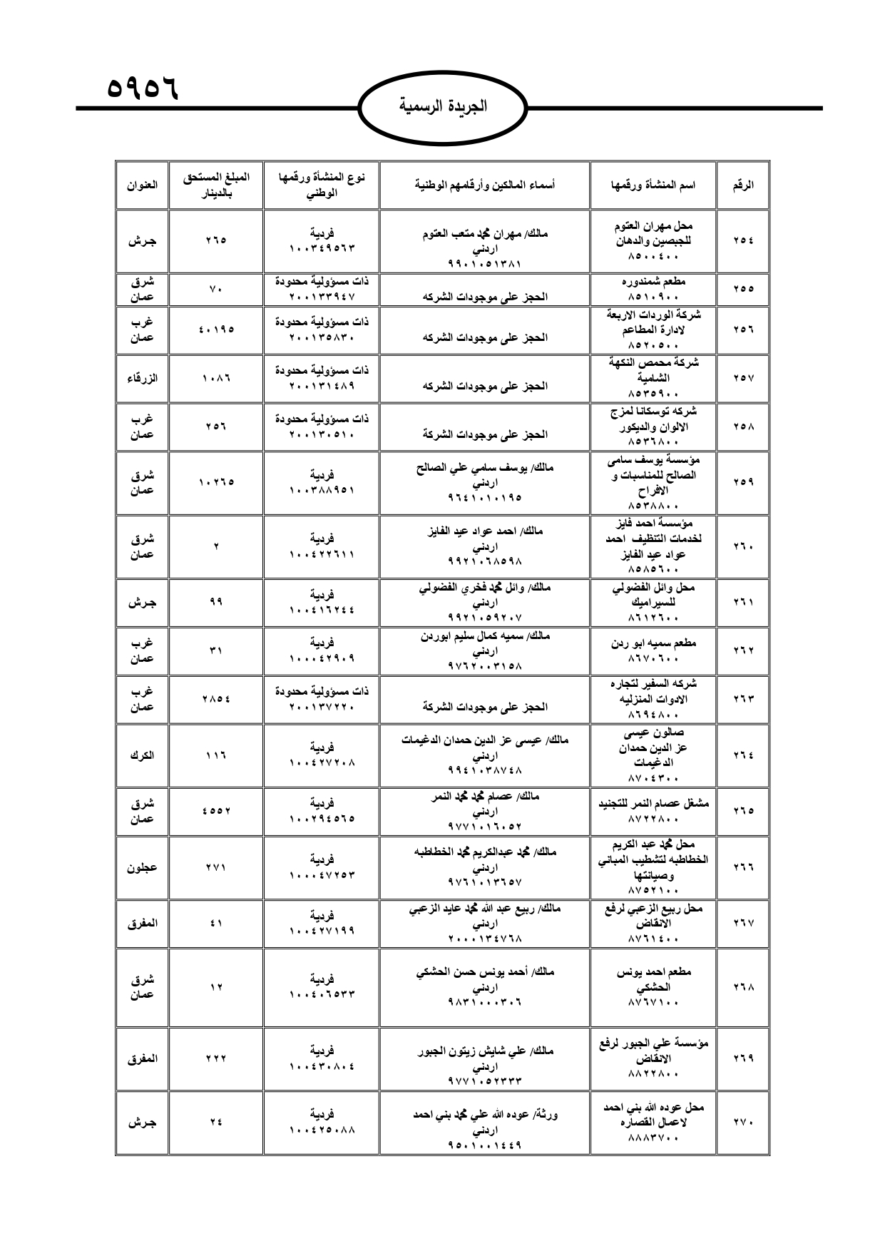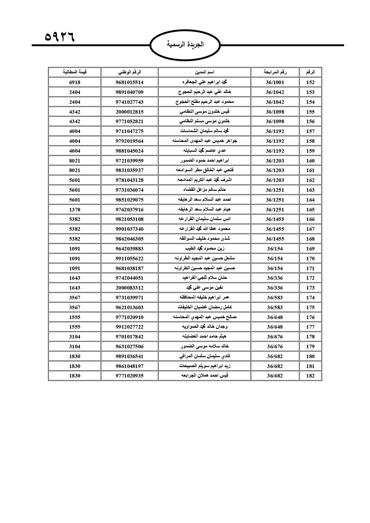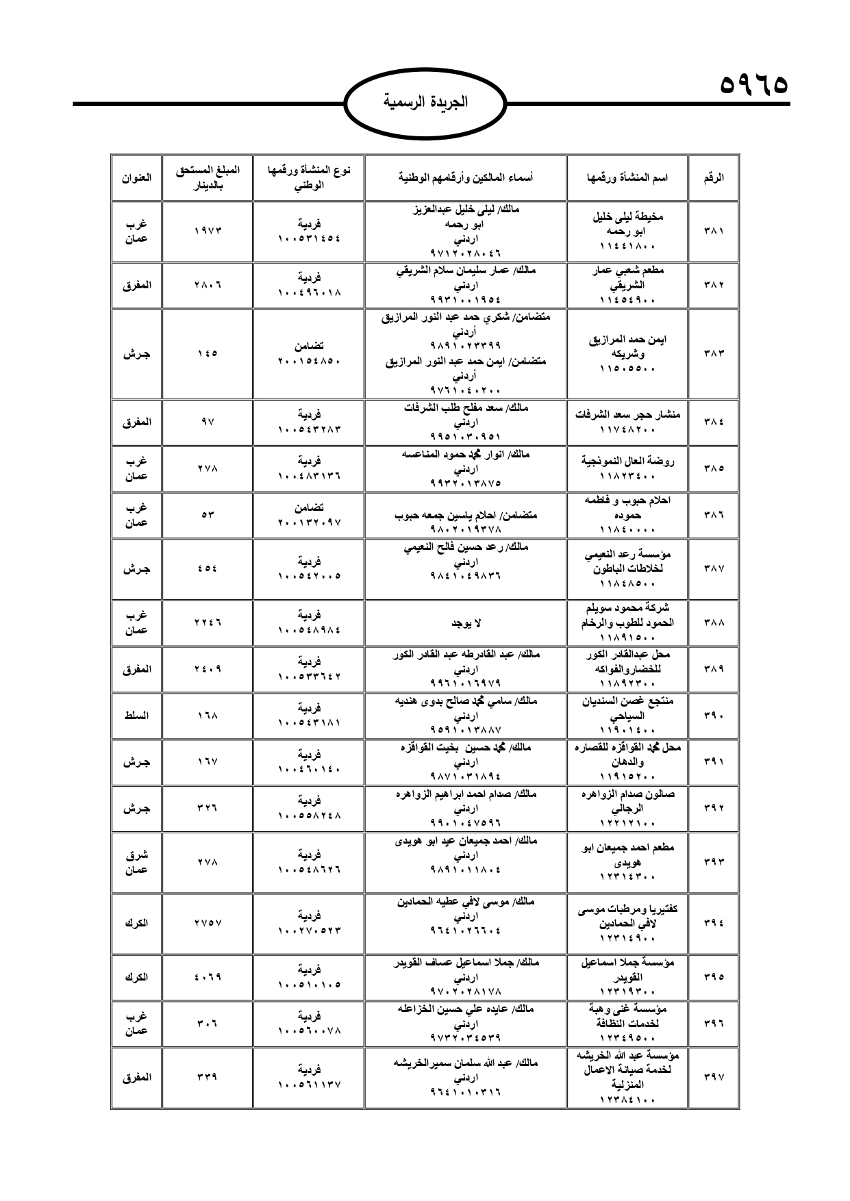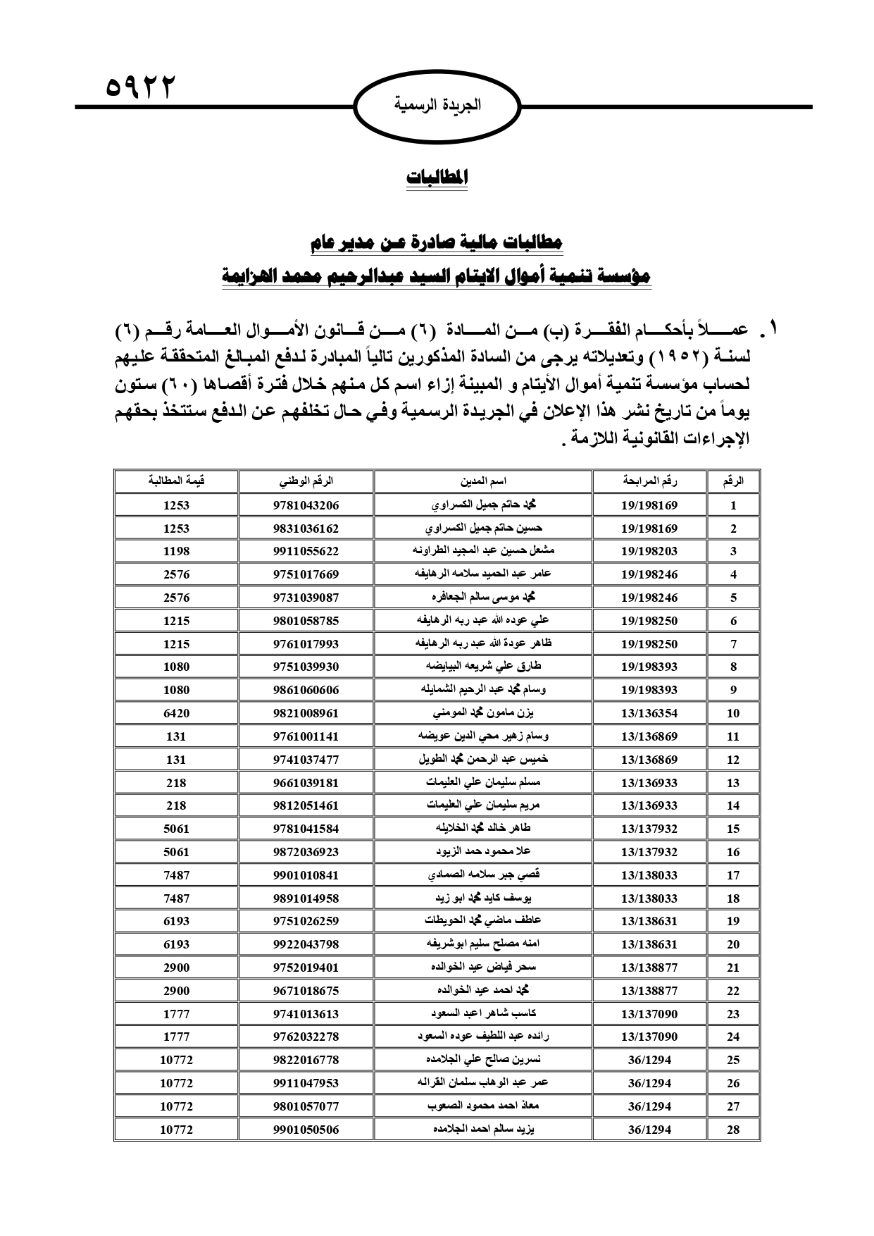 نشرت الجريدة الرسمية في عددها الصادر يوم أمس الخميس، قائمة تضم آلاف الأردنيين المترتبة بحقهم مبالغ مالية لصالح المؤسسة العامة للضمان الاجتماعي ومؤسسة تنمية أموال الأيتام، في خطوة تأتي ضمن الإجراءات القانونية لتحصيل المستحقات المالية المتأخرة.