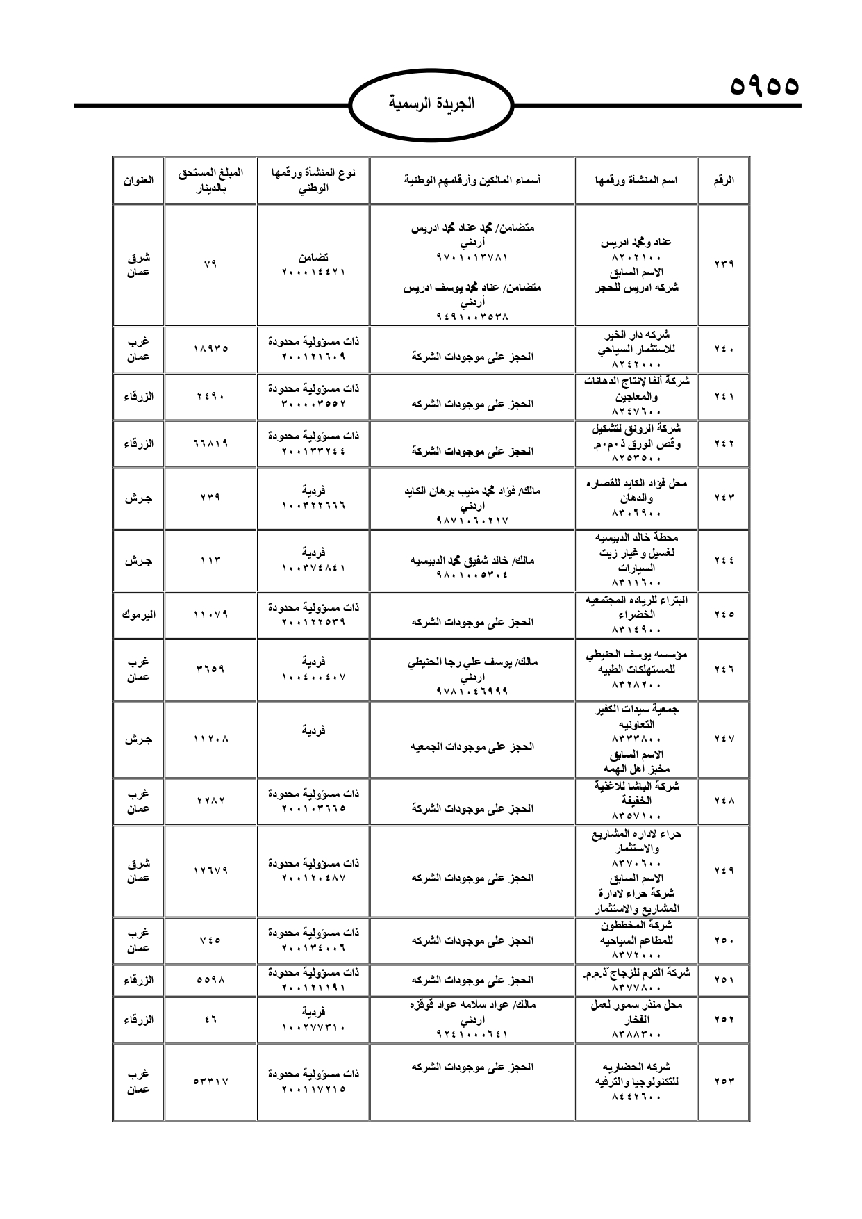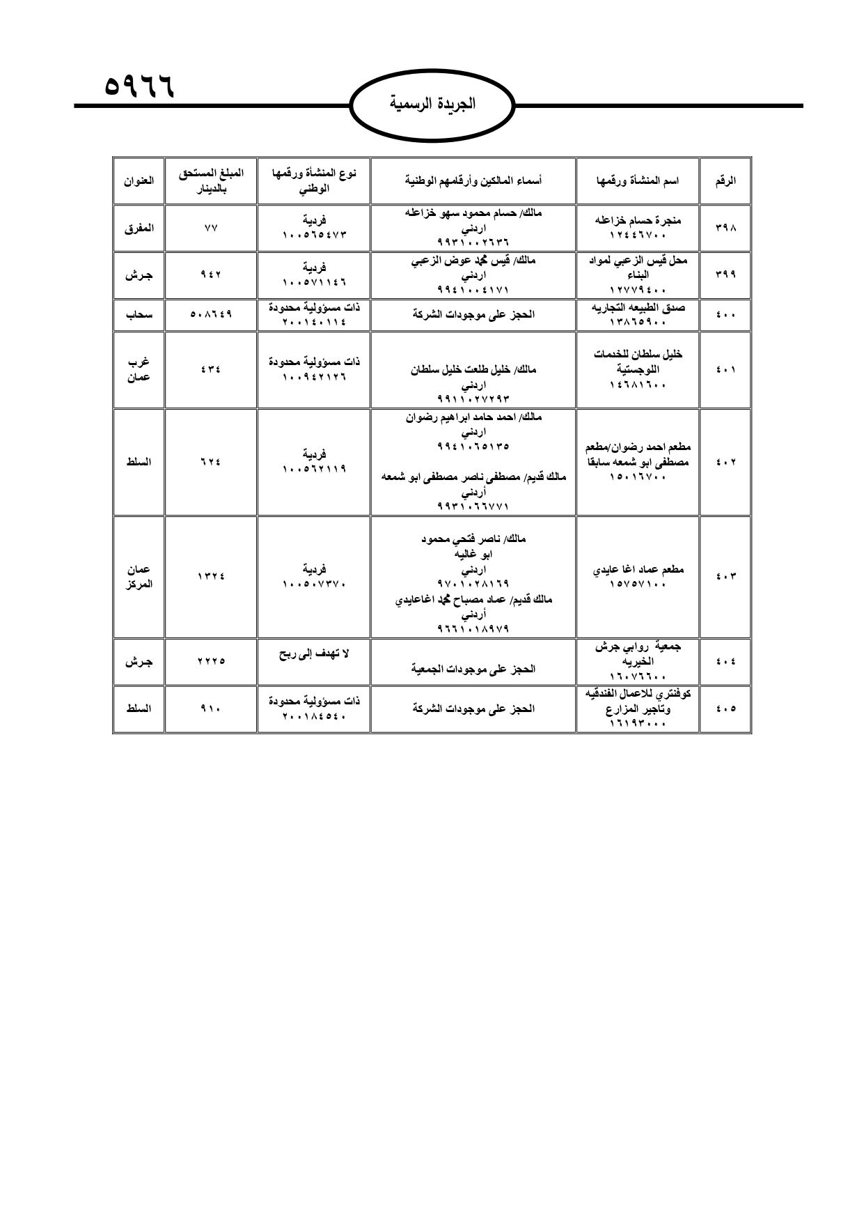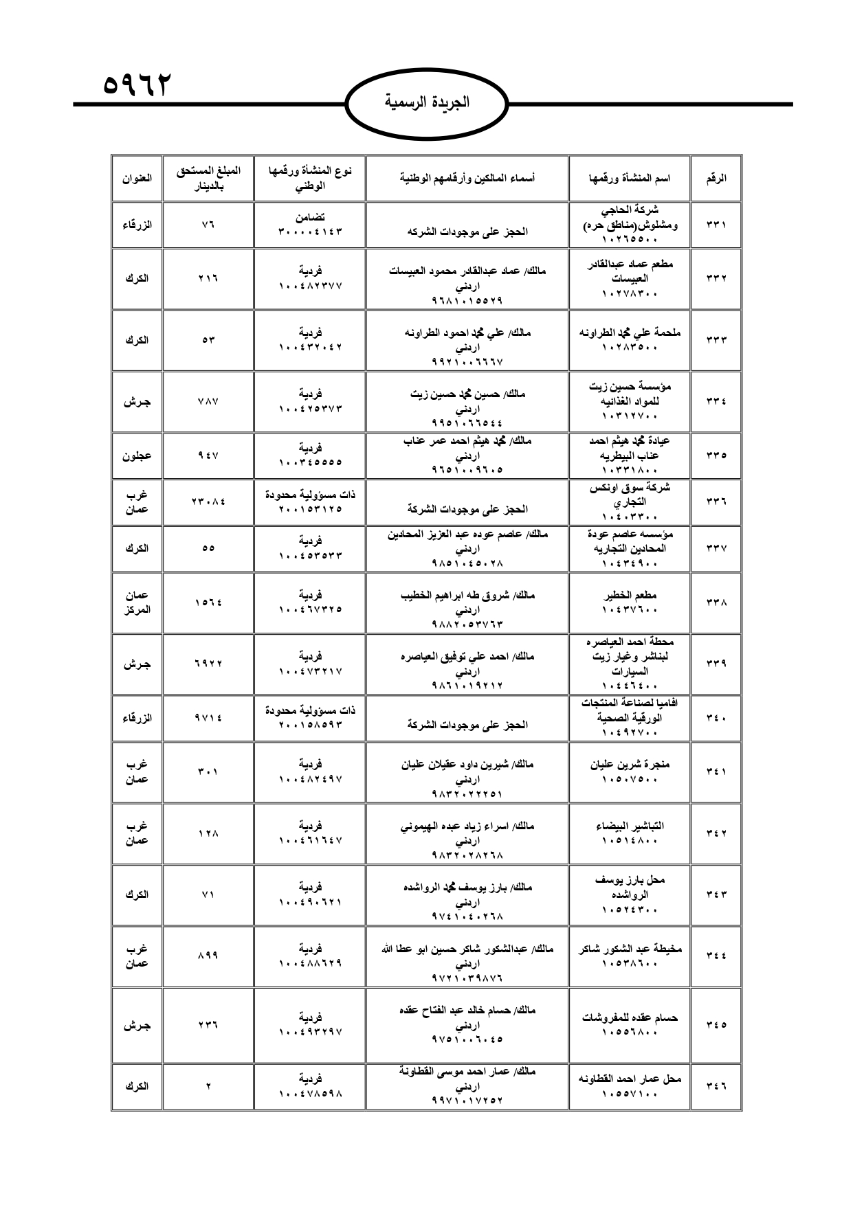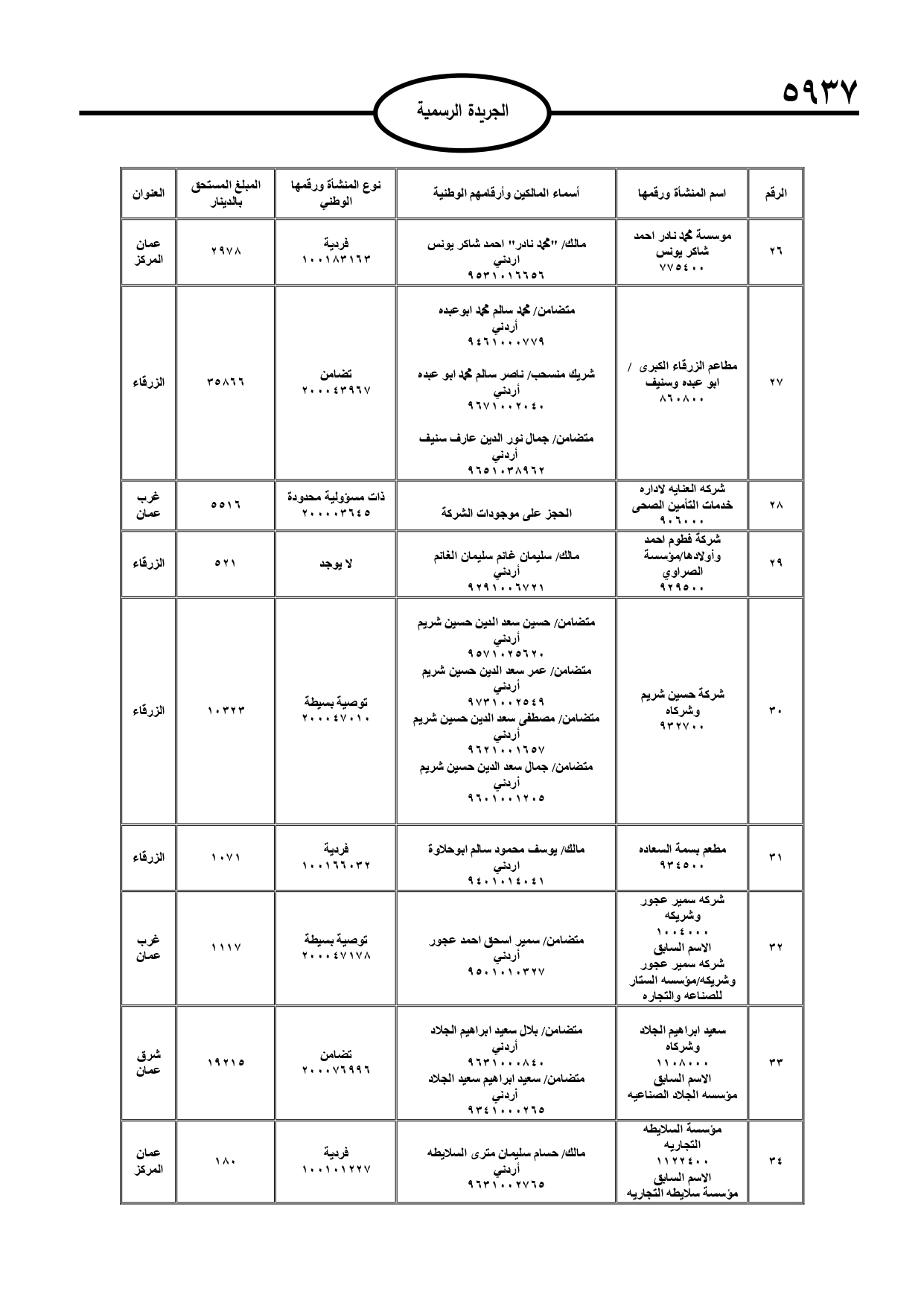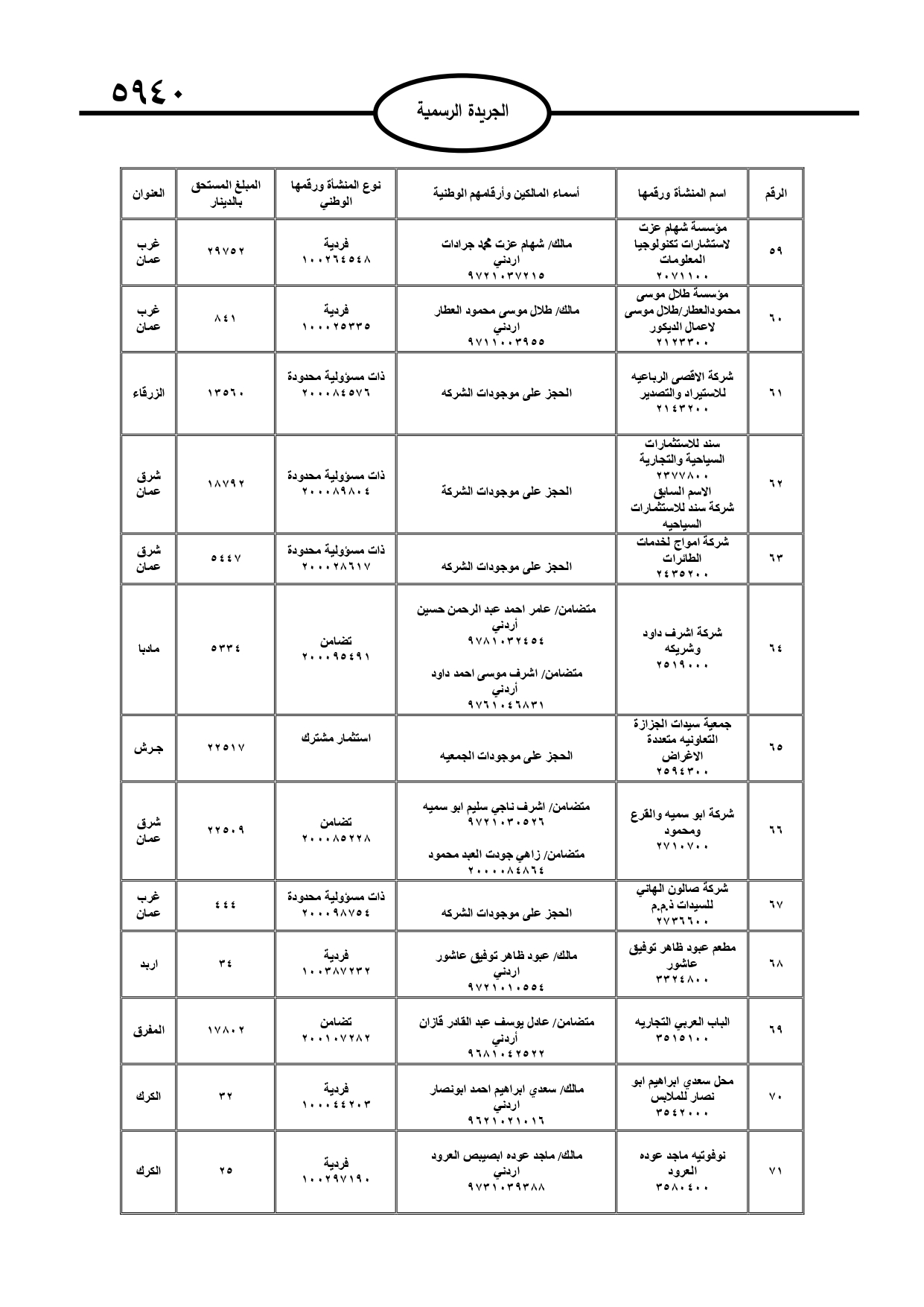 نشرت الجريدة الرسمية في عددها الصادر يوم أمس الخميس، قائمة تضم آلاف الأردنيين المترتبة بحقهم مبالغ مالية لصالح المؤسسة العامة للضمان الاجتماعي ومؤسسة تنمية أموال الأيتام، في خطوة تأتي ضمن الإجراءات القانونية لتحصيل المستحقات المالية المتأخرة.