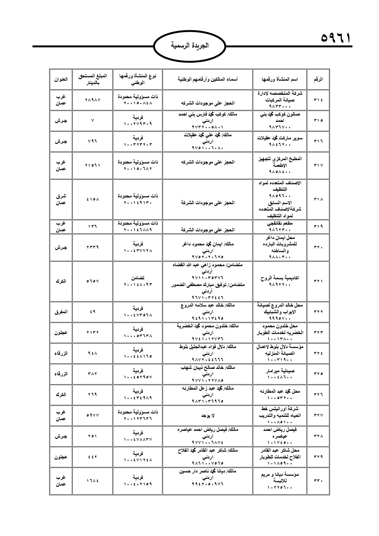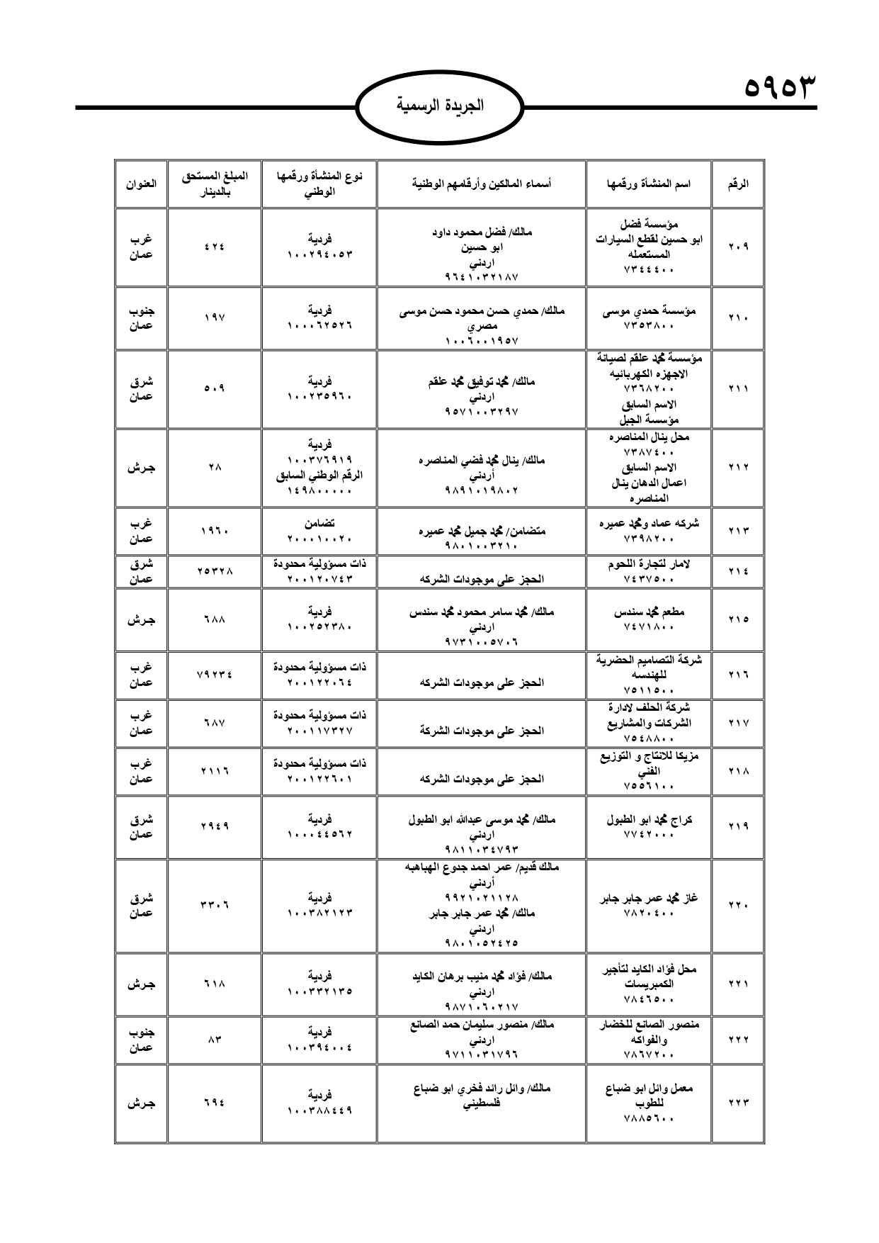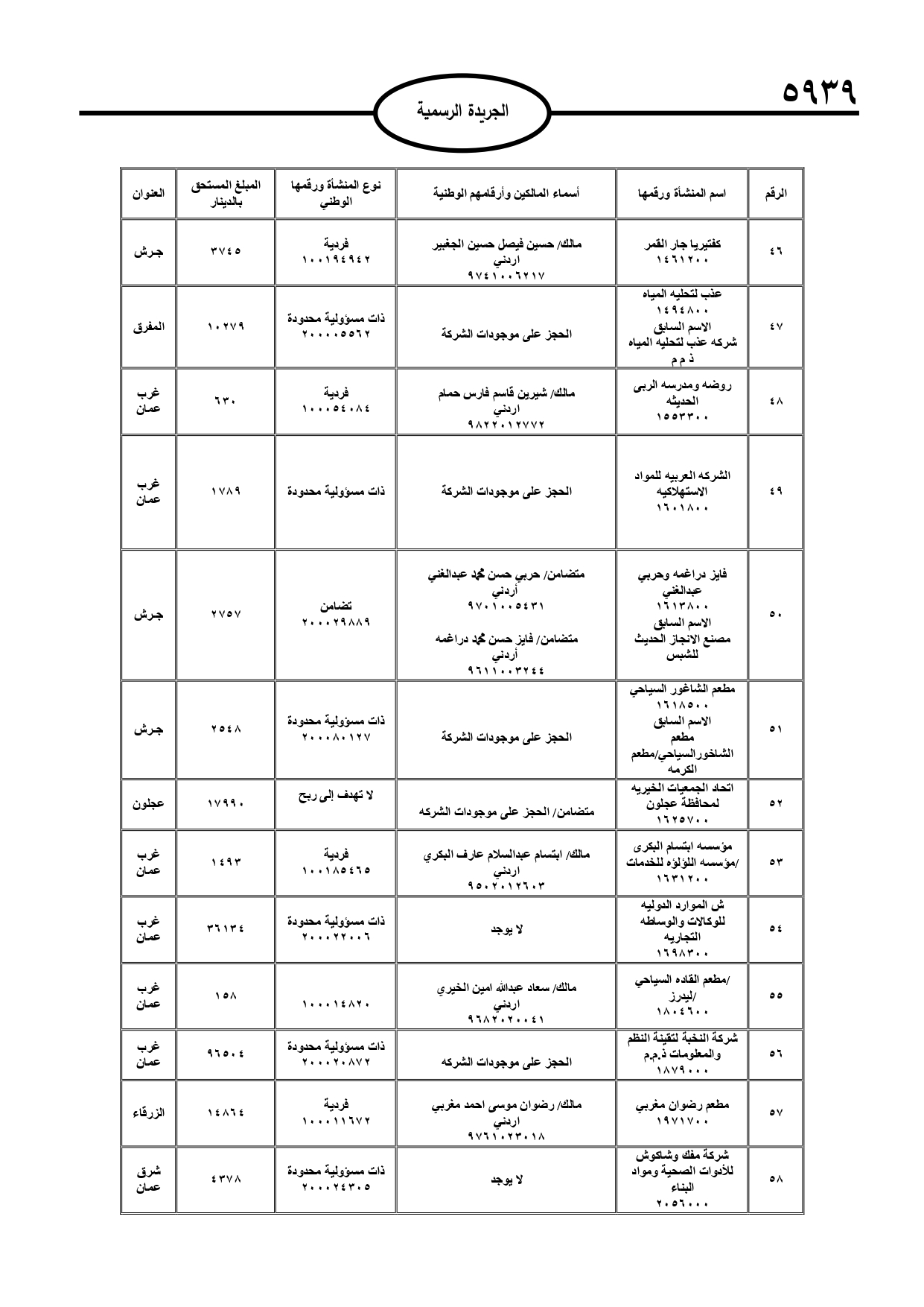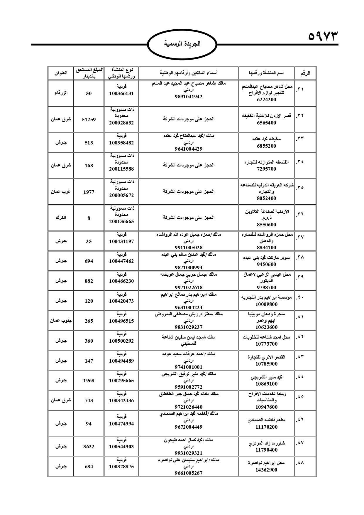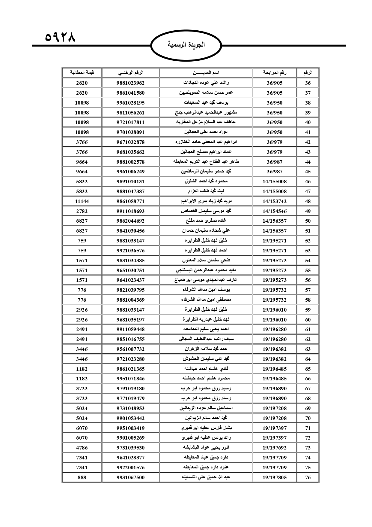 نشرت الجريدة الرسمية في عددها الصادر يوم أمس الخميس، قائمة تضم آلاف الأردنيين المترتبة بحقهم مبالغ مالية لصالح المؤسسة العامة للضمان الاجتماعي ومؤسسة تنمية أموال الأيتام، في خطوة تأتي ضمن الإجراءات القانونية لتحصيل المستحقات المالية المتأخرة.