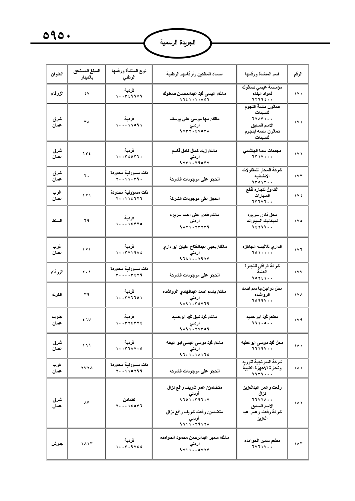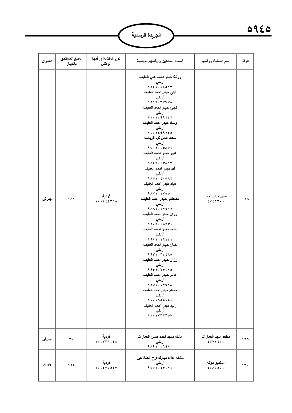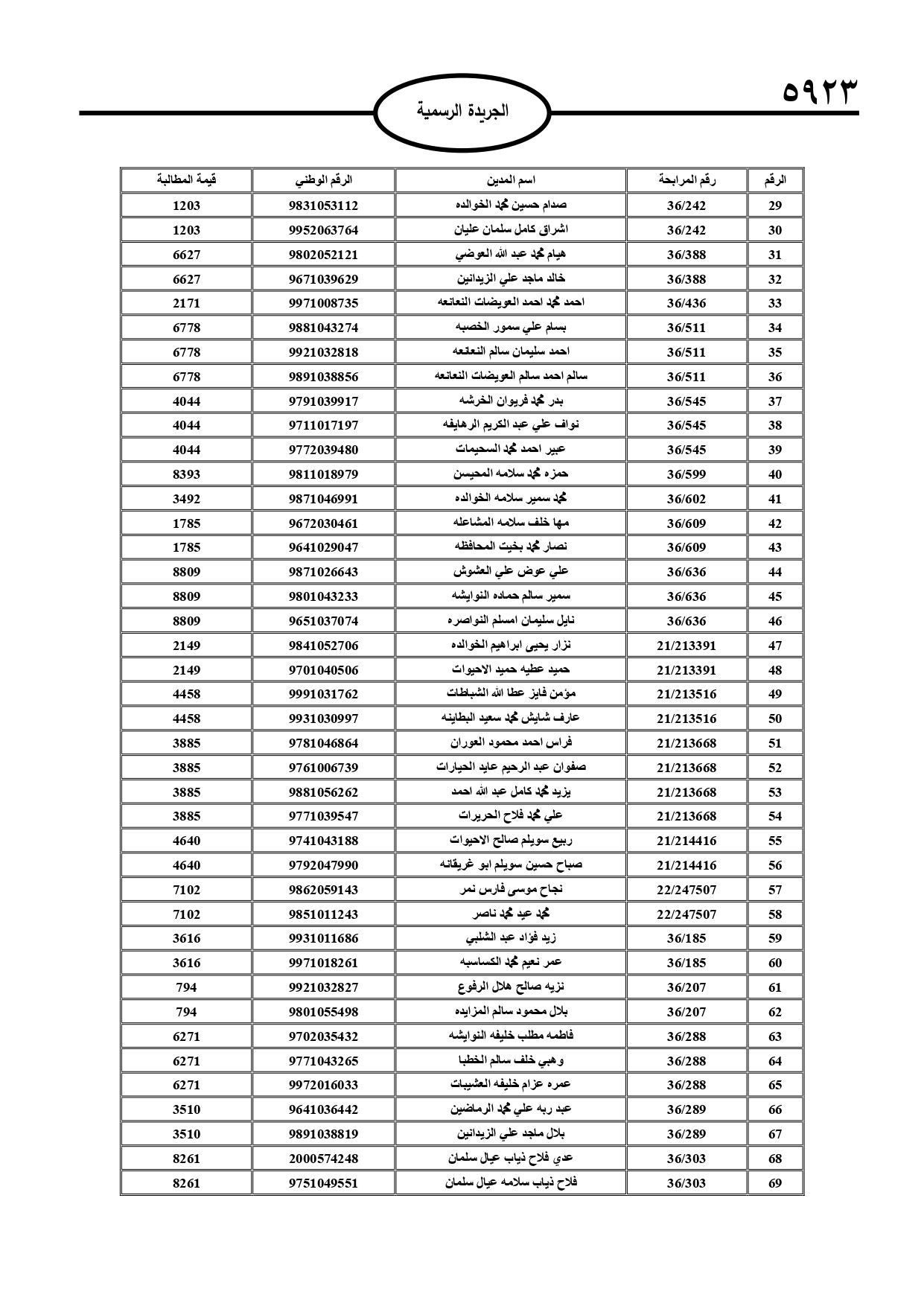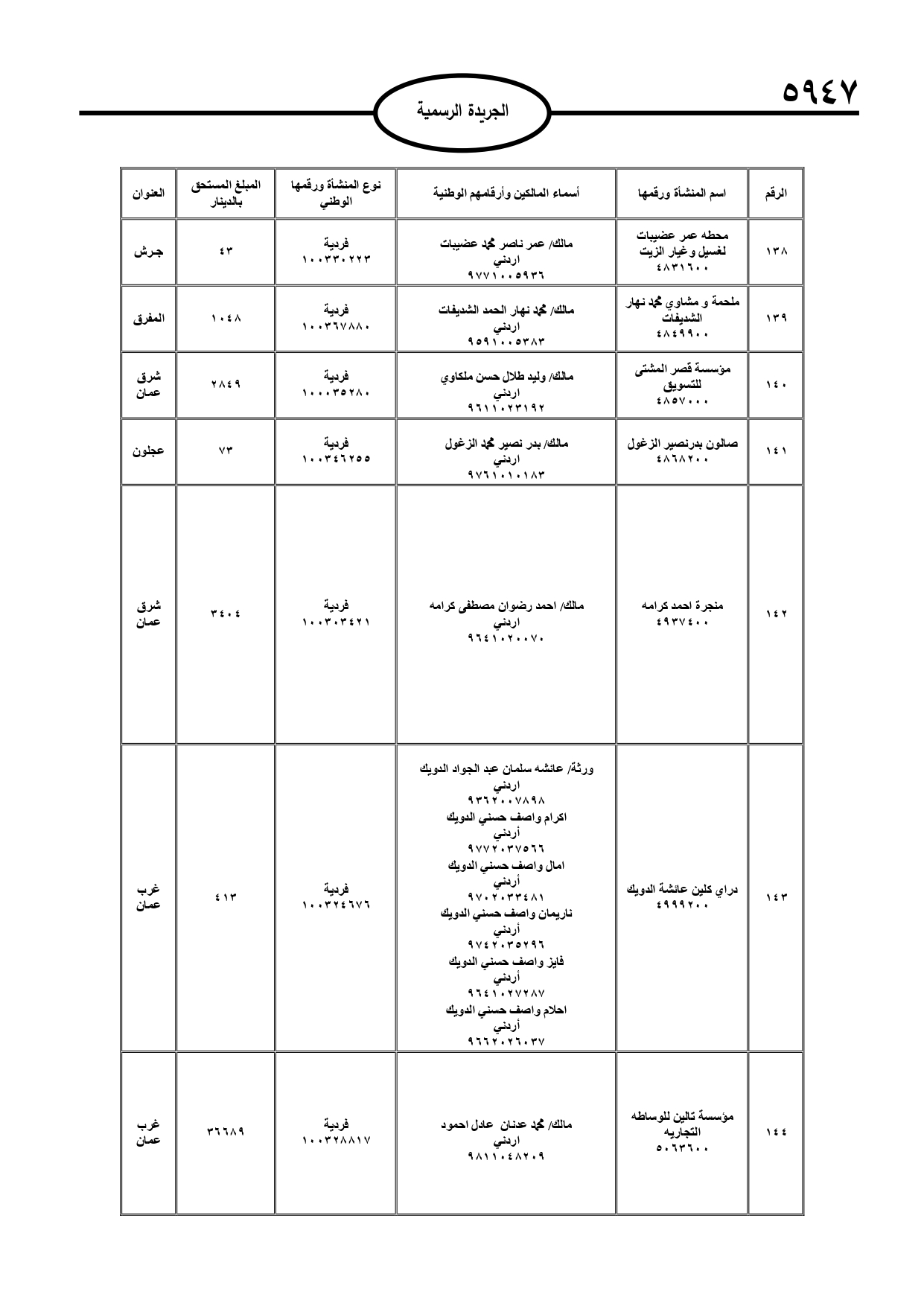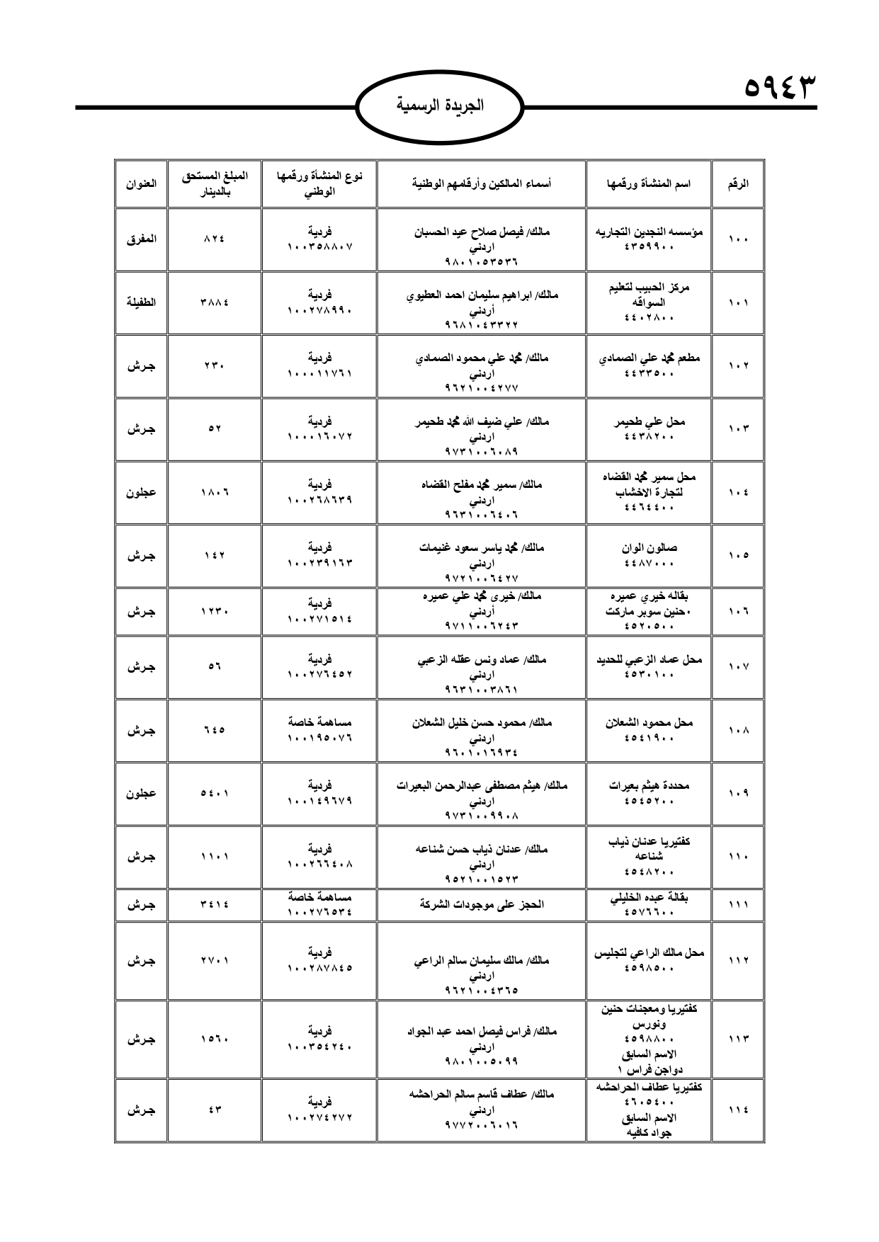 نشرت الجريدة الرسمية في عددها الصادر يوم أمس الخميس، قائمة تضم آلاف الأردنيين المترتبة بحقهم مبالغ مالية لصالح المؤسسة العامة للضمان الاجتماعي ومؤسسة تنمية أموال الأيتام، في خطوة تأتي ضمن الإجراءات القانونية لتحصيل المستحقات المالية المتأخرة.