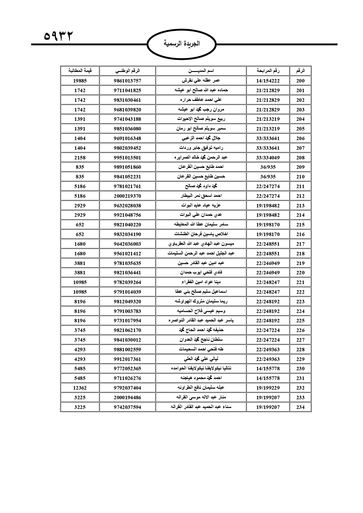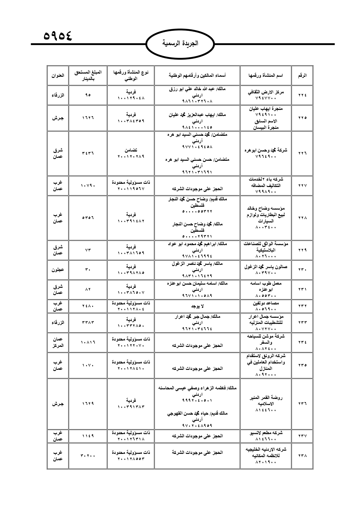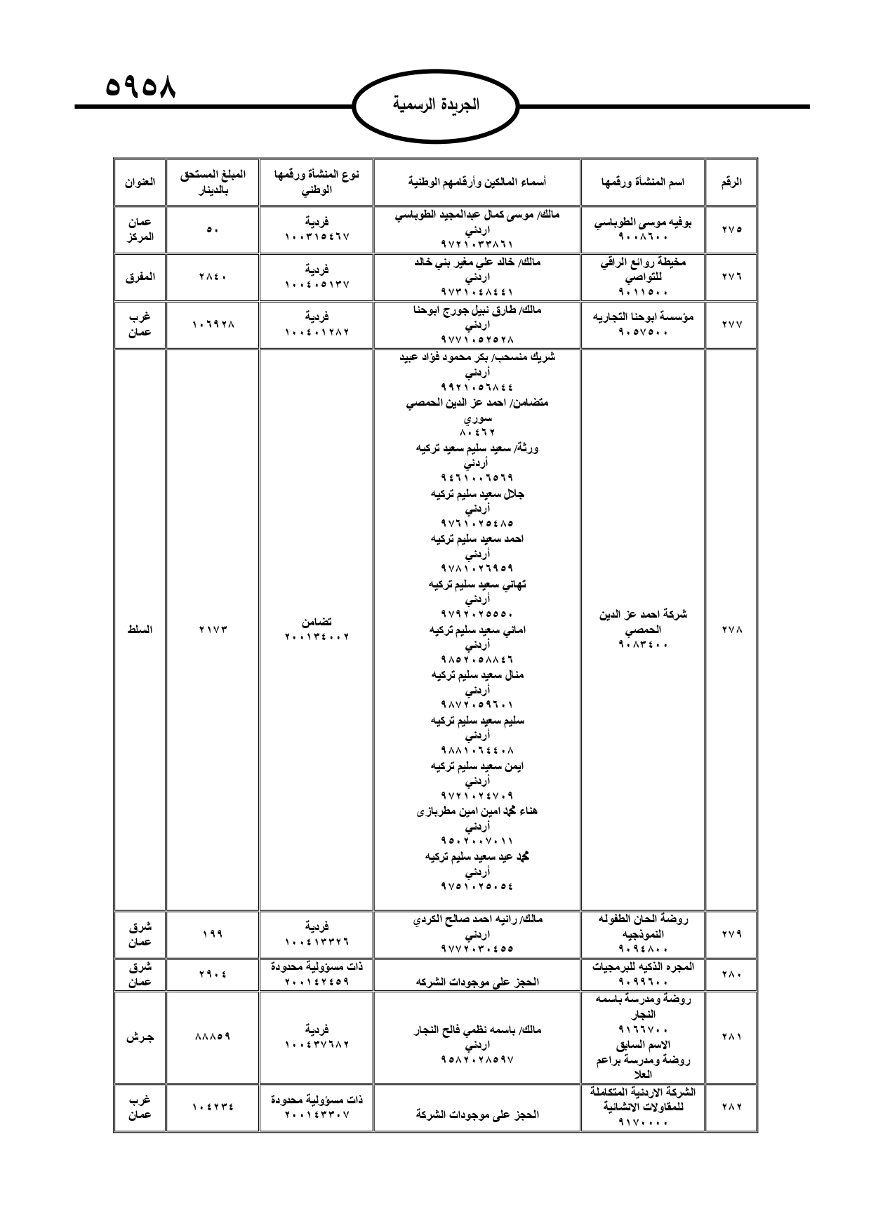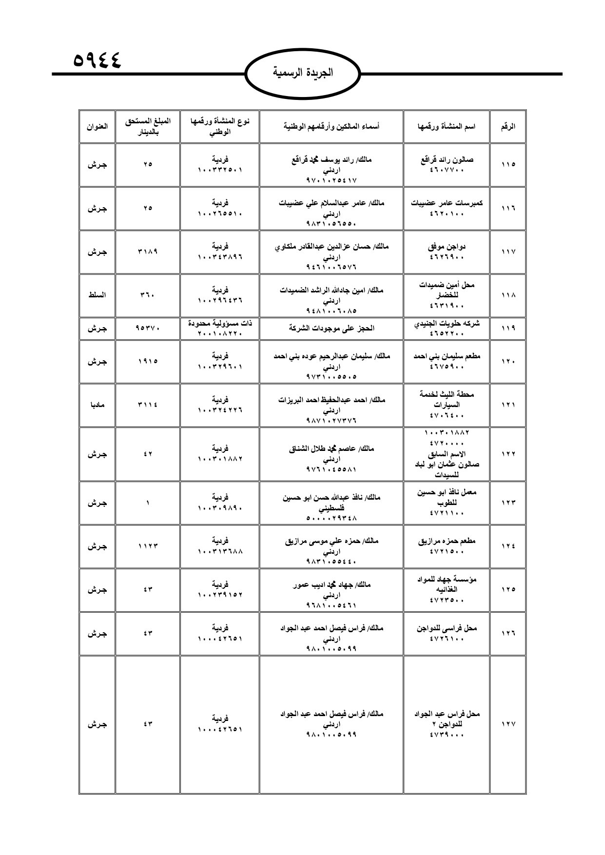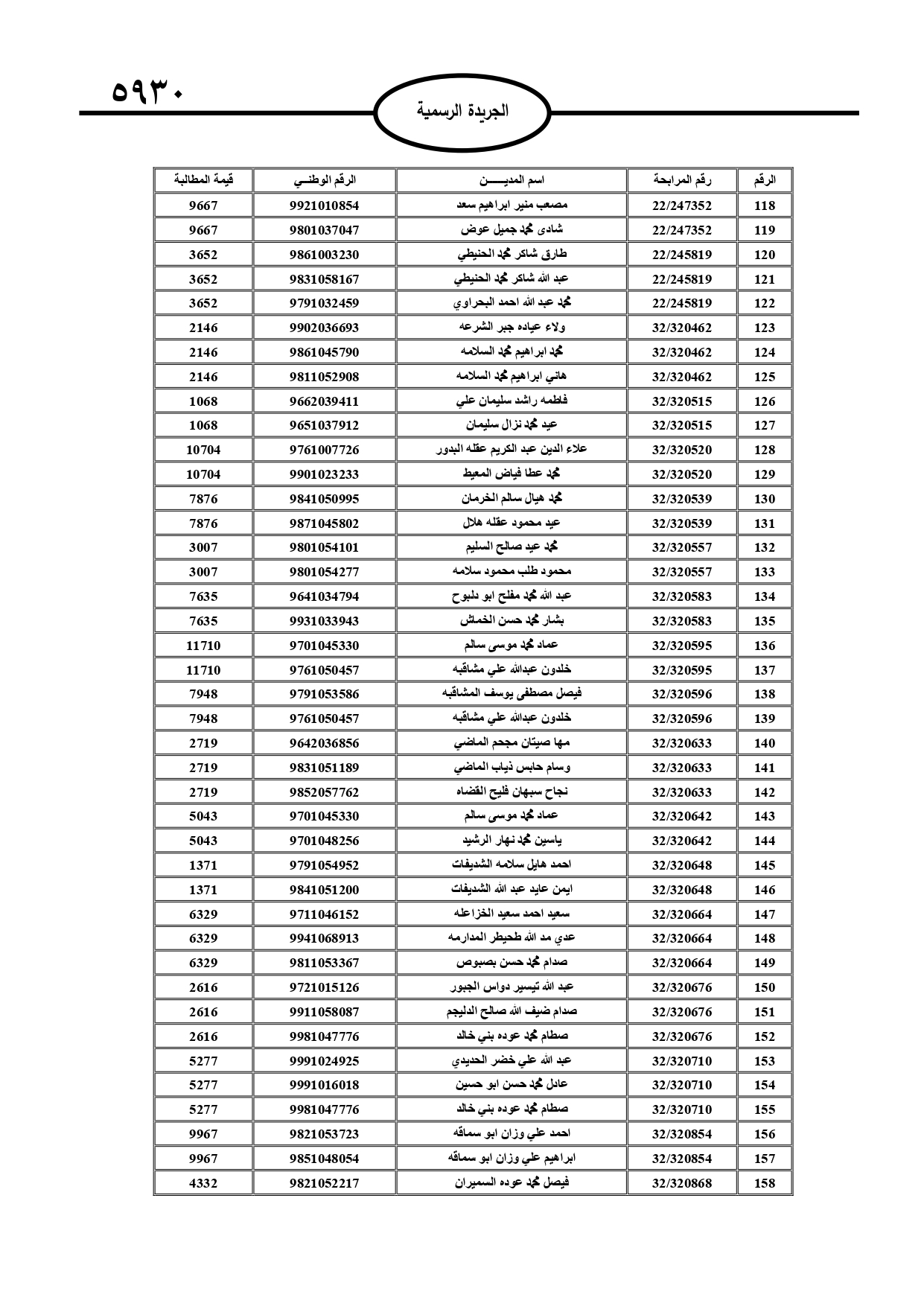 نشرت الجريدة الرسمية في عددها الصادر يوم أمس الخميس، قائمة تضم آلاف الأردنيين المترتبة بحقهم مبالغ مالية لصالح المؤسسة العامة للضمان الاجتماعي ومؤسسة تنمية أموال الأيتام، في خطوة تأتي ضمن الإجراءات القانونية لتحصيل المستحقات المالية المتأخرة.