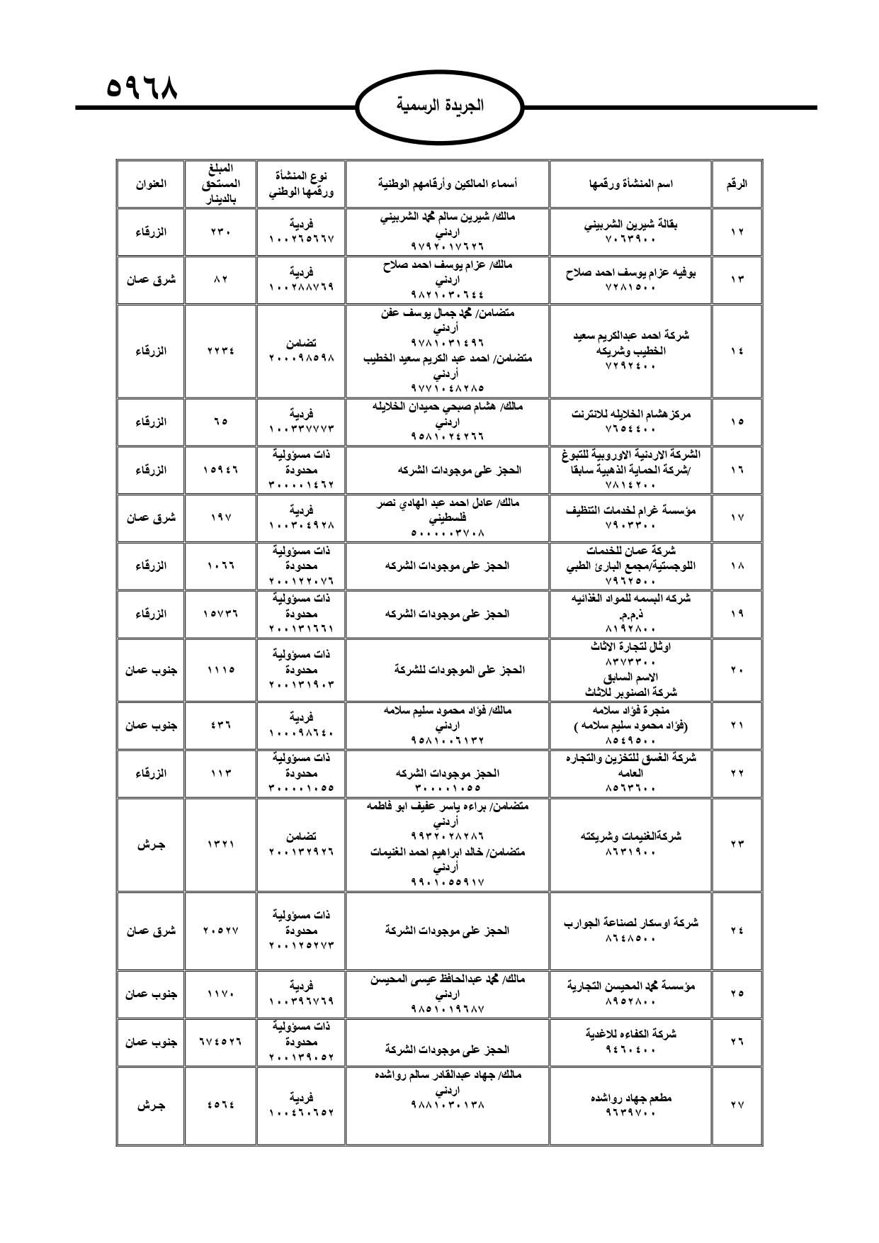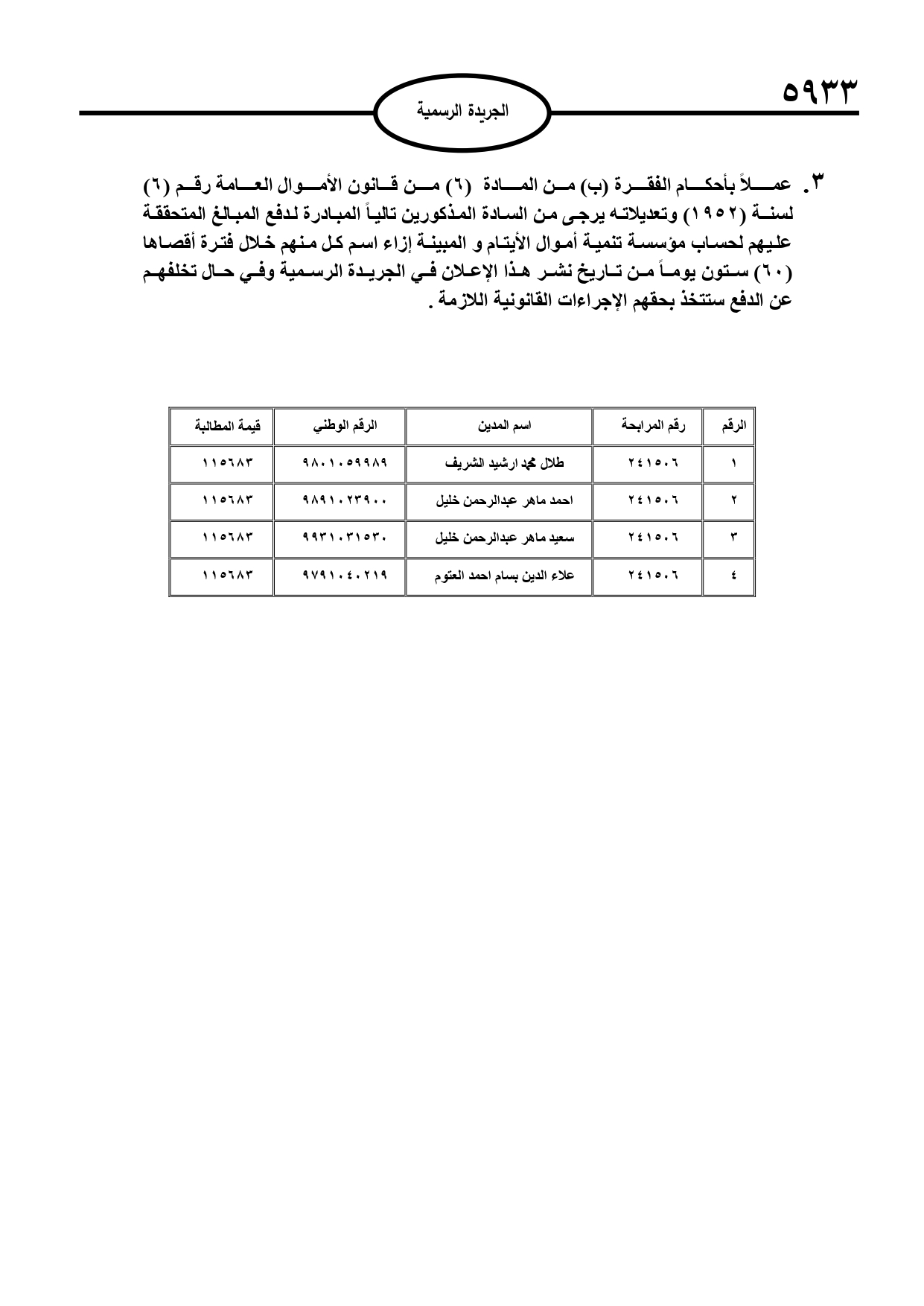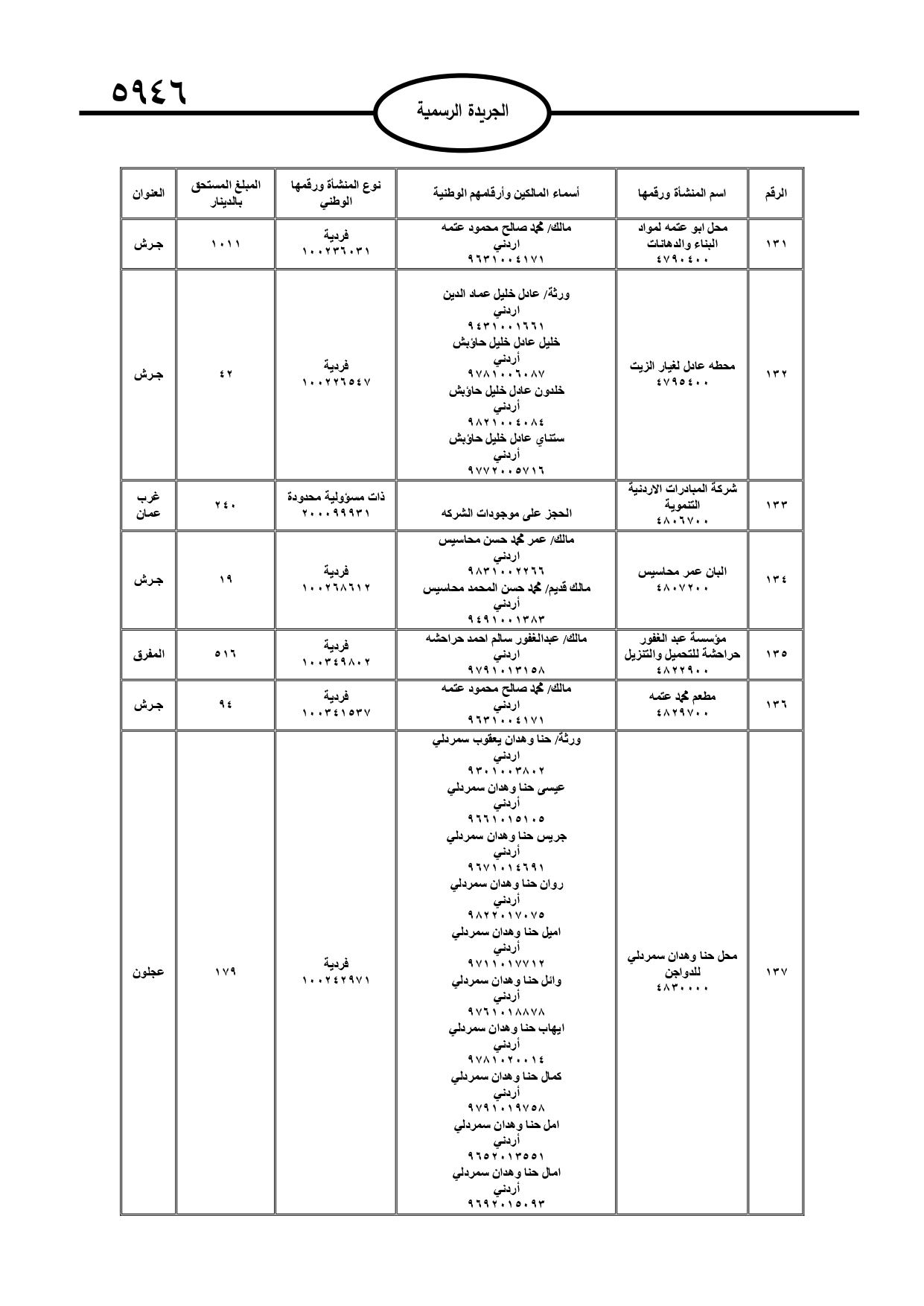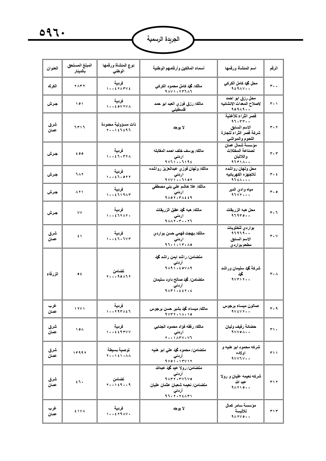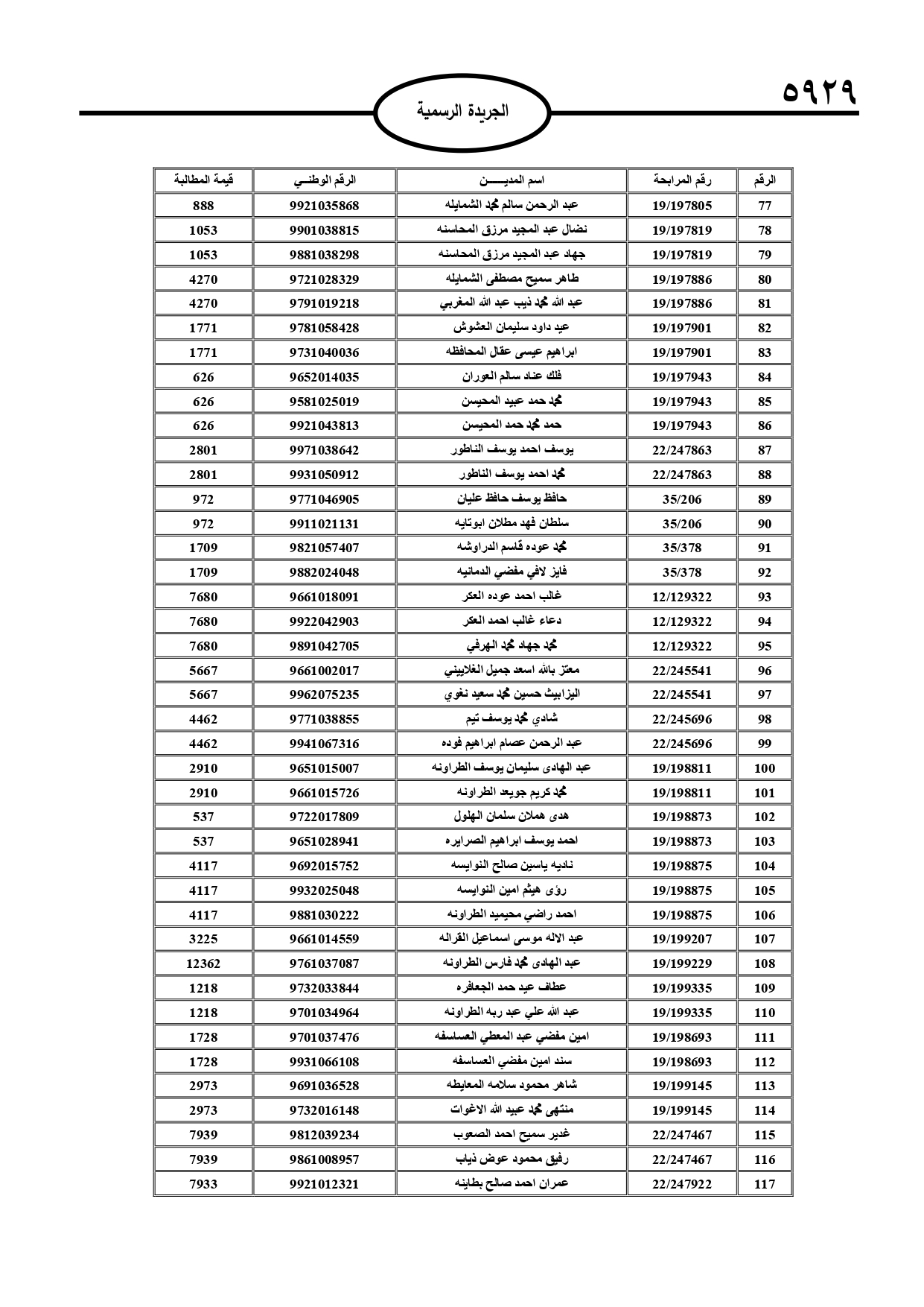 نشرت الجريدة الرسمية في عددها الصادر يوم أمس الخميس، قائمة تضم آلاف الأردنيين المترتبة بحقهم مبالغ مالية لصالح المؤسسة العامة للضمان الاجتماعي ومؤسسة تنمية أموال الأيتام، في خطوة تأتي ضمن الإجراءات القانونية لتحصيل المستحقات المالية المتأخرة.