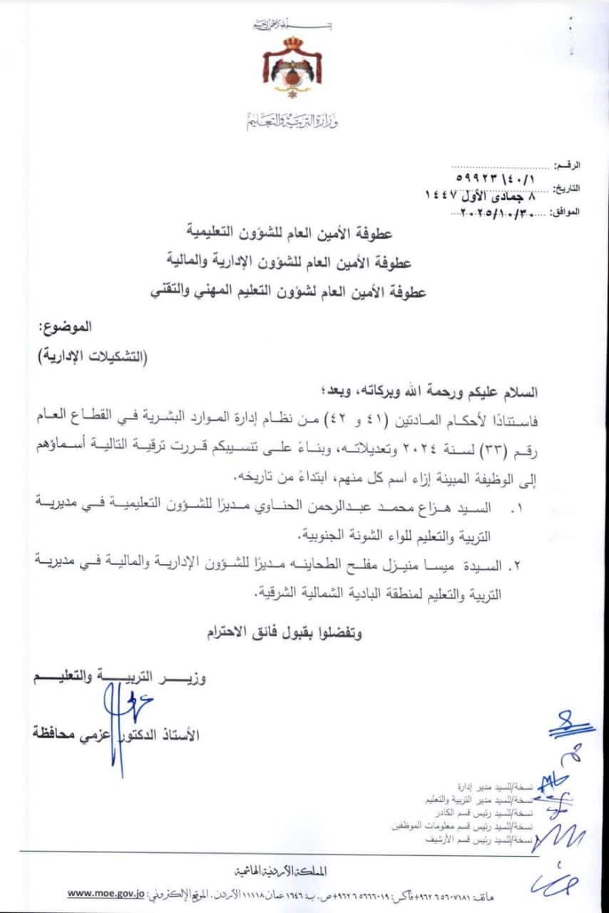 وشملت التشكيلات تعيين عدد من مدراء التربية والتعليم، إلى جانب مدراء للشؤون الإدارية والمالية
