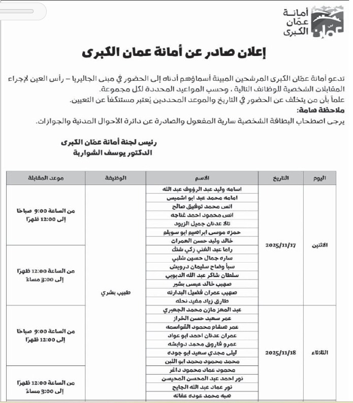 أعلنت أمانة عمّان الكبرى اليوم الثلاثاء عن دعوة عدد من المتقدمين لإجراء المقابلات الشخصية ضمن إجراءات التعيين في عدد من الوظائف المعلن عنها سابقًا.