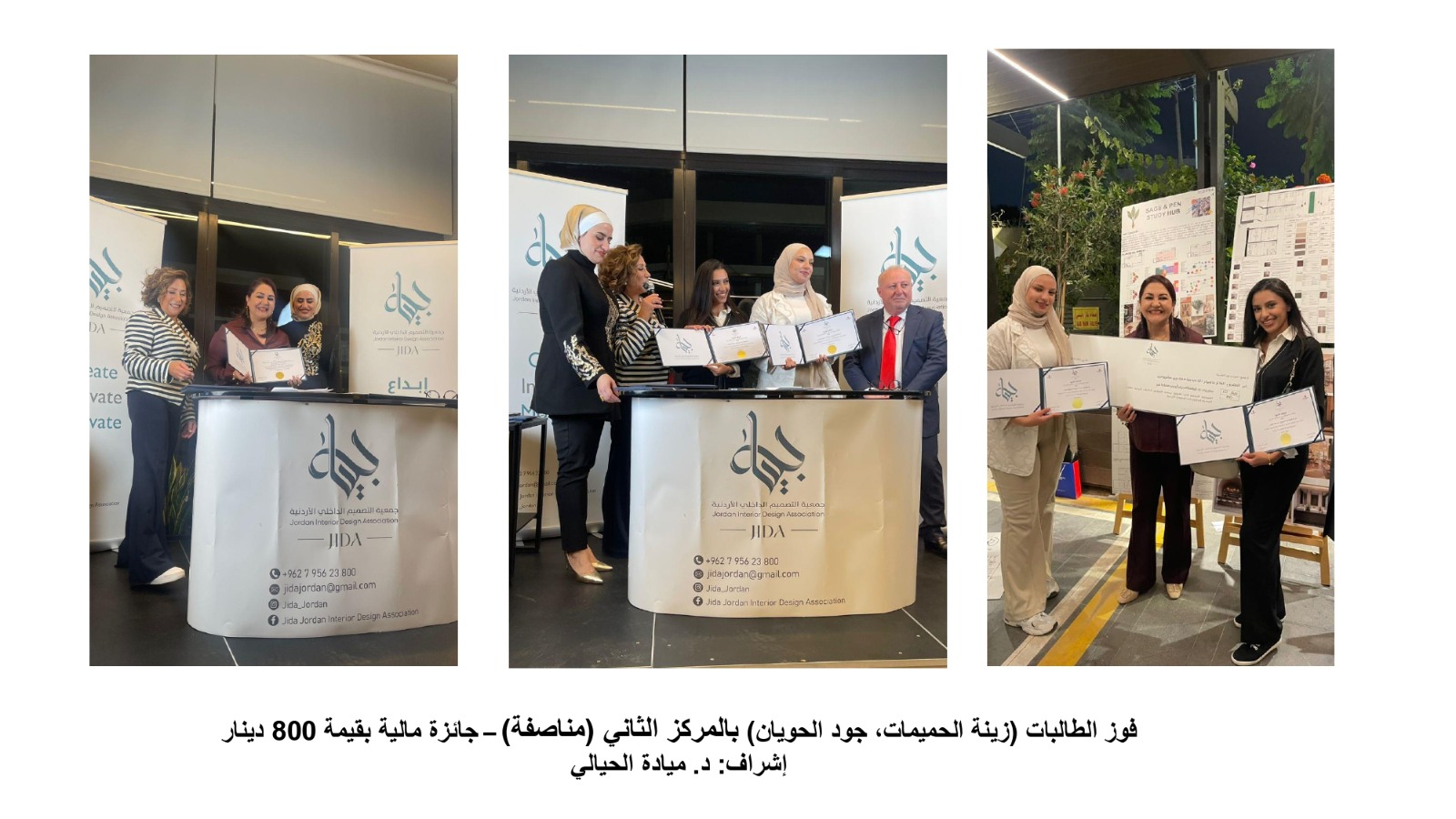 وفازت بالمركز الثاني مناصفة، وجائزة نقدية بقيمة ثمانمائة دينار، الطالبتان زينة الحميمات وجود الحويان، بإشراف الدكتورة ميادة الحيالي. كما حصدت الجائزة التقديرية الأولى، من أصل أربع جوائز تقديرية، الطالبتان زينب الصافي وراما حسن، بإشراف الدكتورة ميادة الحيالي أيضا.