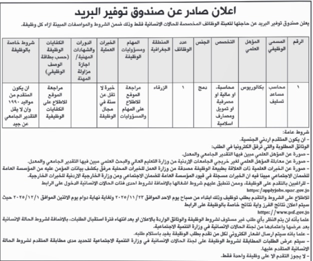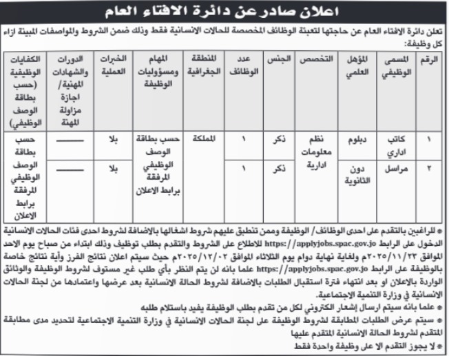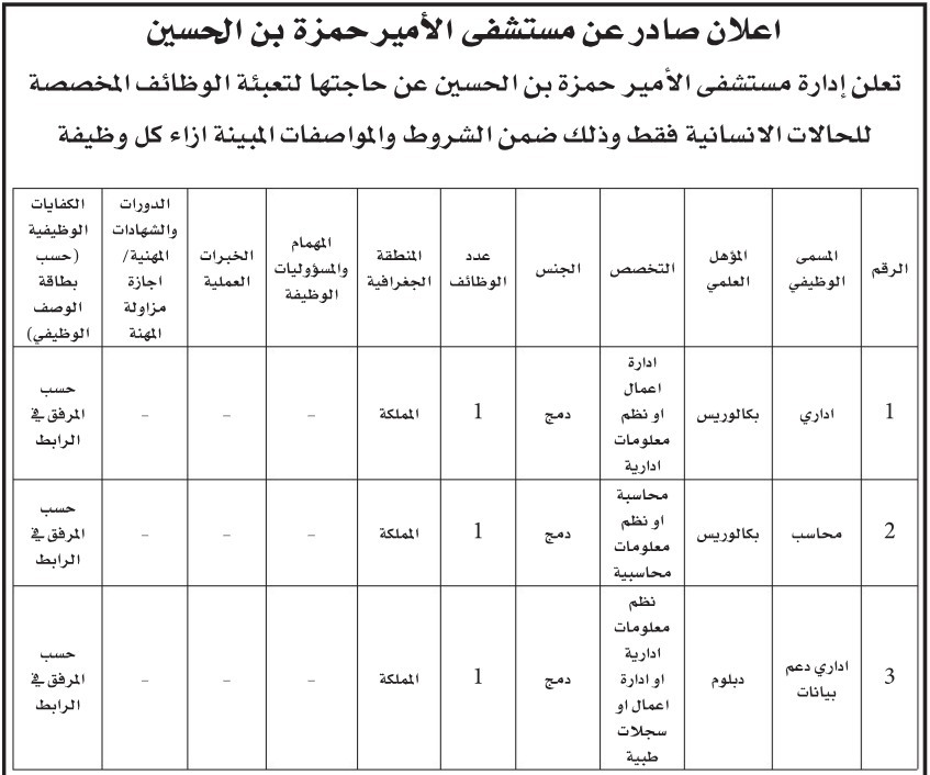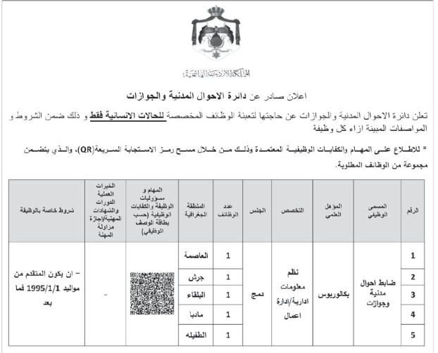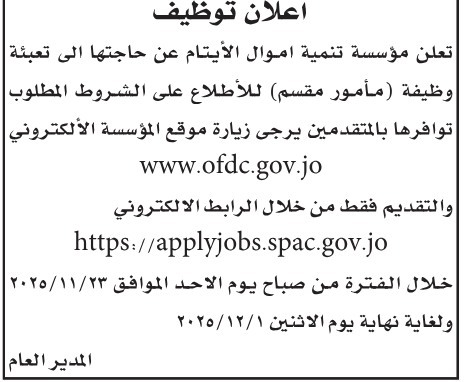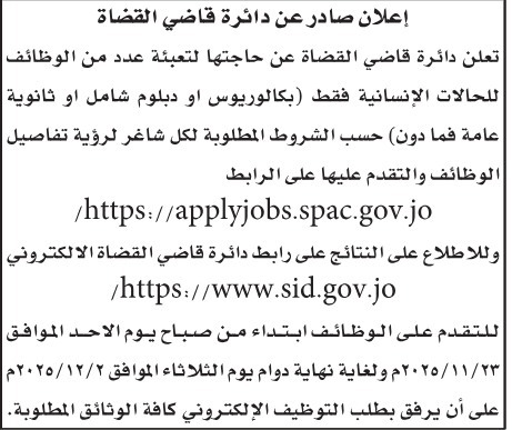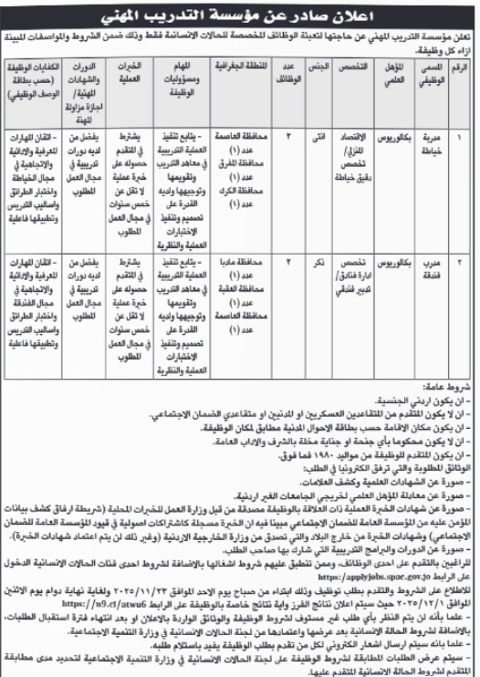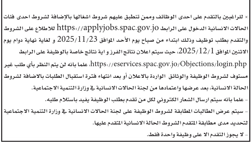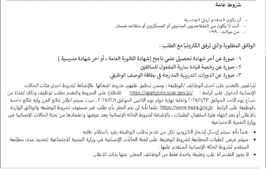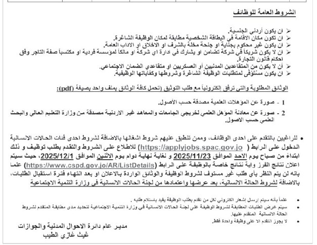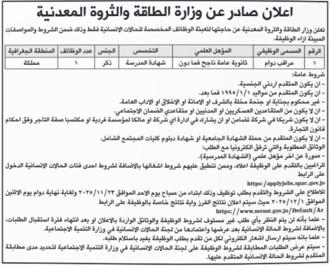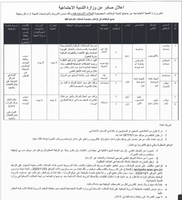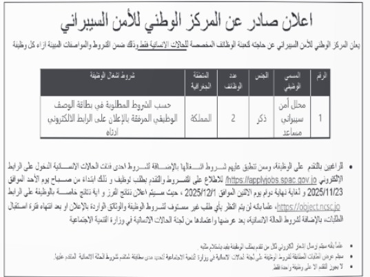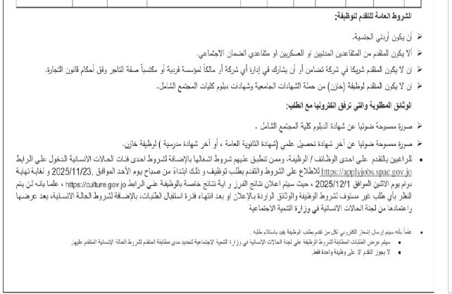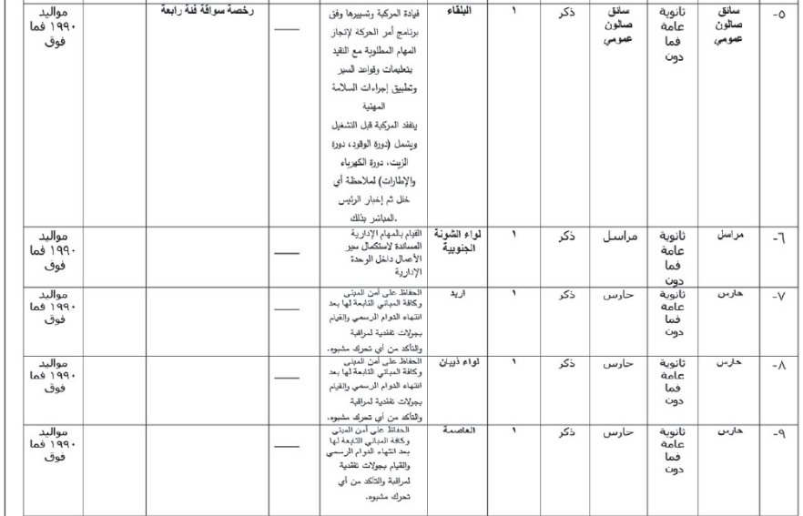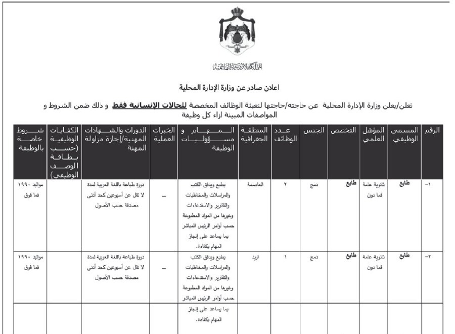 أعلنت عدد من الوزارات والمؤسسات الحكومية اليوم الأحد عن توفر وظائف شاغرة لديها، ودعت الراغبين ممن تنطبق عليهم الشروط للتقدم ضمن المواعيد والآليات المحددة في الإعلانات الرسمية لكل جهة.