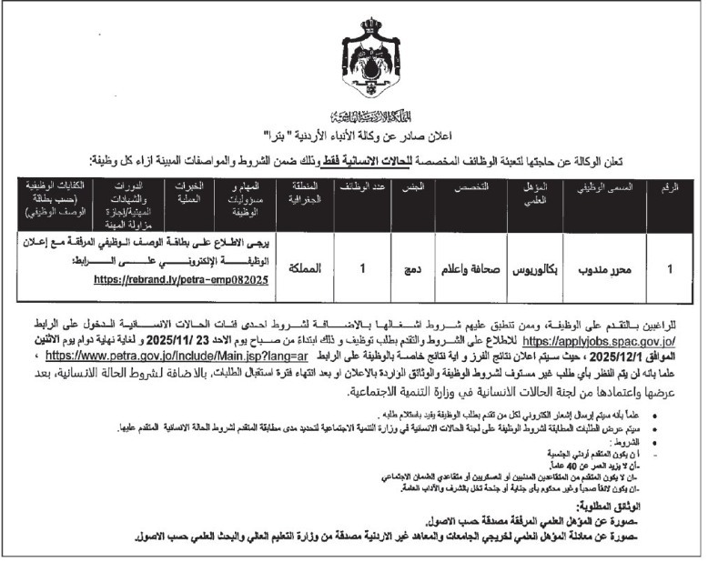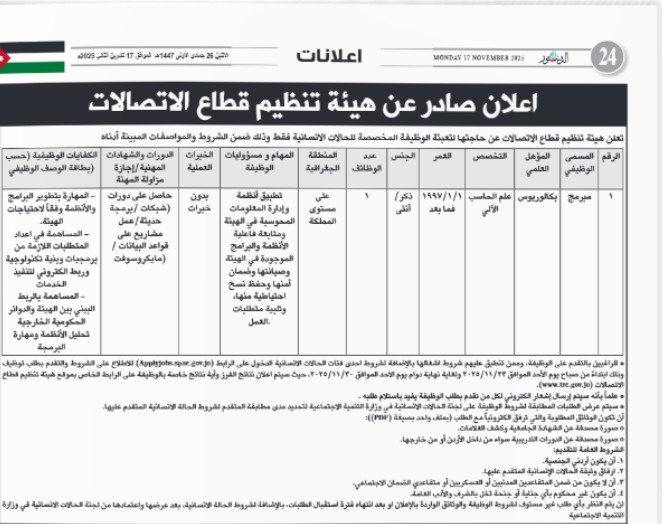 أعلنت عدد من المؤسسات والجهات الحكومية اليوم الاثنين عن توفر وظائف شاغرة لديها، ودعت الراغبين ممّن تنطبق عليهم الشروط للتقدّم وفق التفاصيل الواردة في الإعلانات الرسمية لكل جهة.