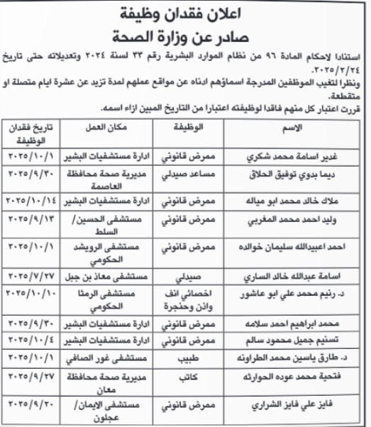 أعلنت وزارة الصحة عن إنهاء خدمات عدد من الموظفين لديها، وذلك استنادًا لأحكام المادة (96) من نظام إدارة الموارد البشرية رقم 33 لسنة 2024 وتعديلاته، بعد ثبوت تغيبهم غير المبرر عن مواقع عملهم لمدة تزيد عن عشرة أيام، سواء كانت متصلة أو متقطعة.