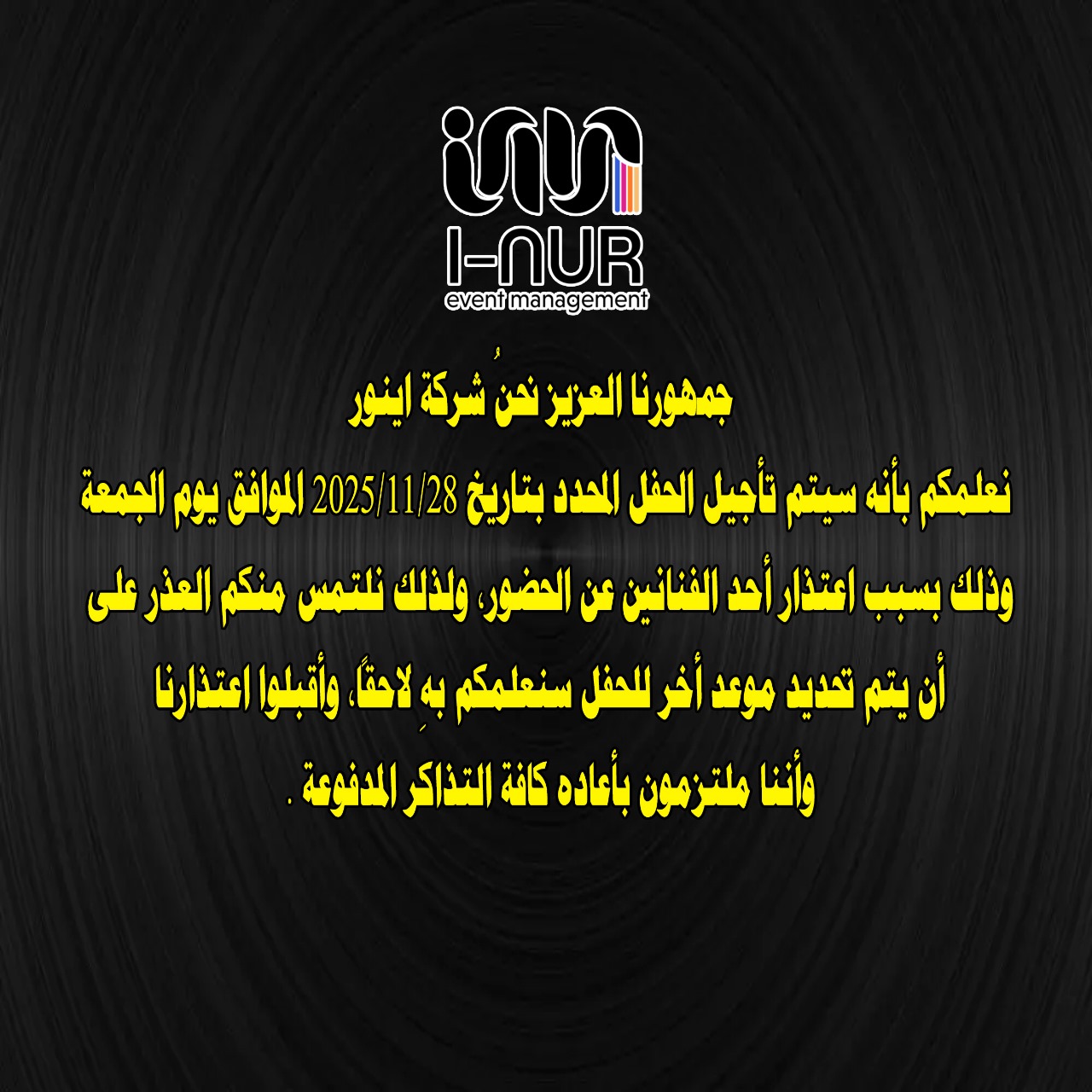 أعلت شركة اينور عن تأجيل حفل الفنانة بيسان إسماعيل بسبب اعتذار أحد الفنانين عن الحفل المقرر اقامته يوم الجمعة القادم.