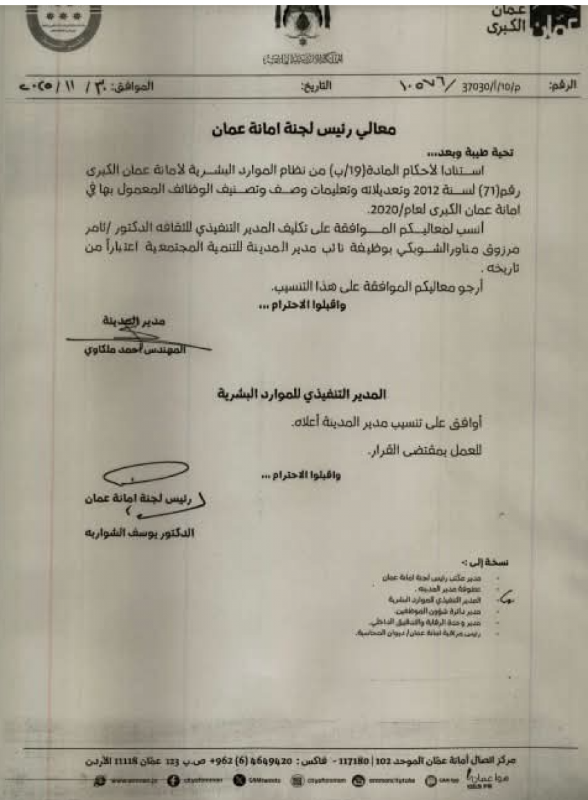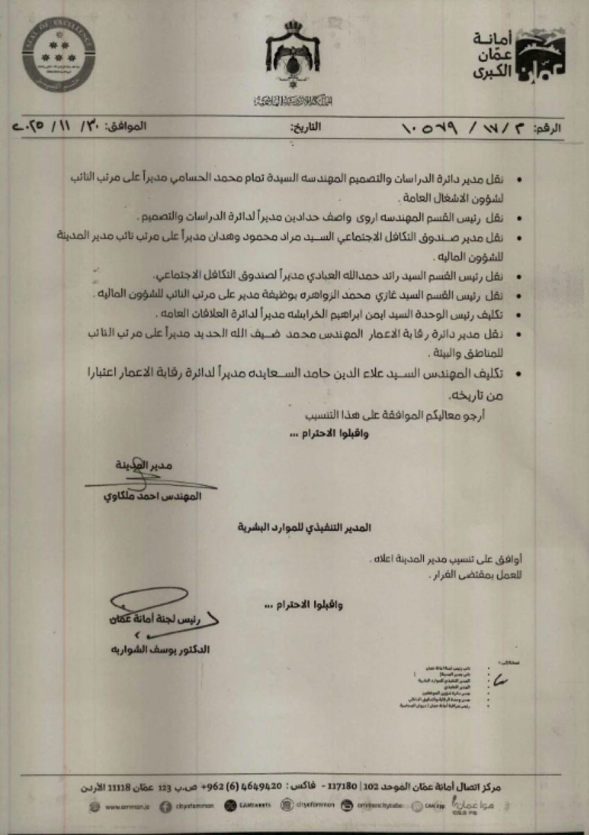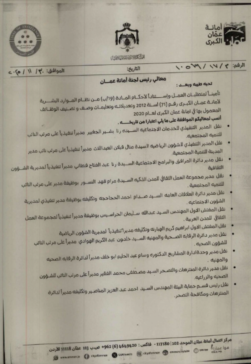 وافق رئيس لجنة أمانة عمان الكبرى الدكتور يوسف الشواربة الموافقة على تنسيب مدير المدينة، بإجراء تنقلات شاملة شملت مدراء تنفيذيين ومدراء ورؤساء أقسام في مختلف القطاعات داخل الأمانة.
