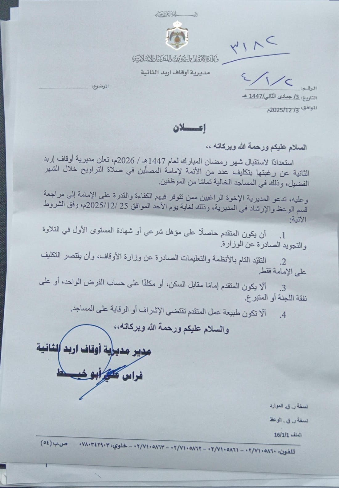 مع اقتراب شهر رمضان المبارك لعام 1447هـ / 2026، أعلنت مديرية أوقاف إربد الثانية عن فتح باب التسجيل للراغبين في إحياء شعيرة صلاة التراويح في المساجد التي لا يتوفر فيها أئمة أو موظفون رسميون، مؤكدة أن الهدف هو ضمان إقامة الصلاة في جميع المساجد المستهدفة وفق الضوابط الشرعية والإدارية.