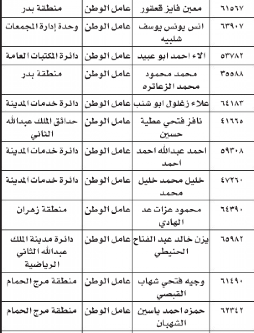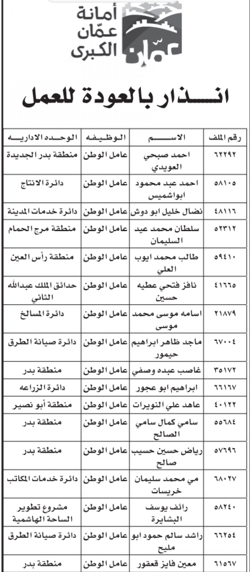 أنذرت أمانة عمان الكبرى عددًا من عمال الوطن بضرورة العودة إلى عملهم خلال مدة لا تتجاوز 3 أيام، والا تعرضوا للفصل.
