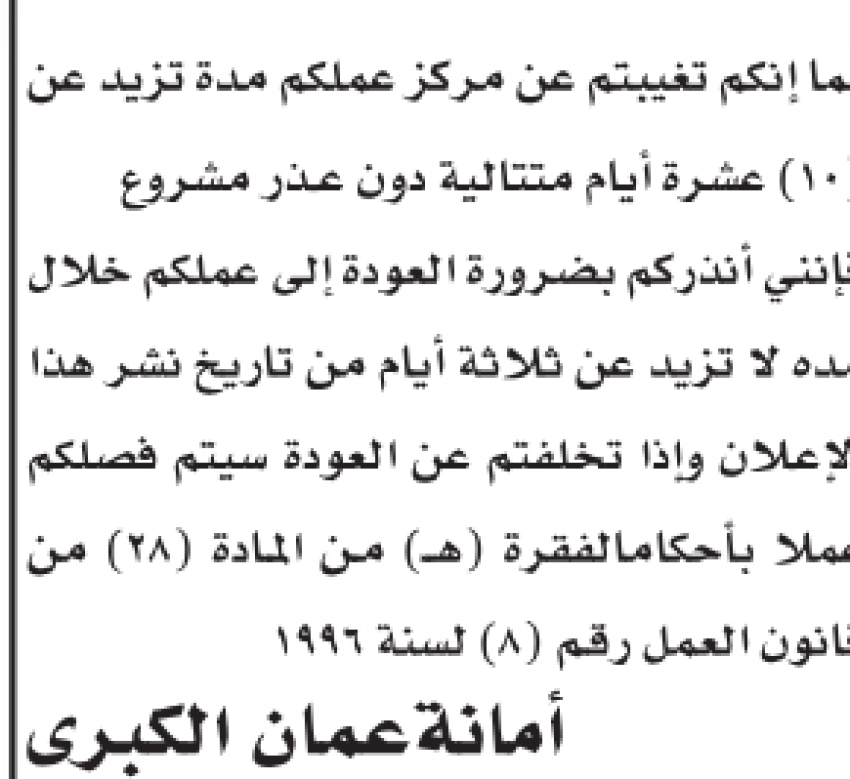 وبحسب إعلان للأمانة، فإنّ سبب توجيه الإنذار للعمال يأتي بعد تغيبهم لمدة 10 أيام بدون عذر.