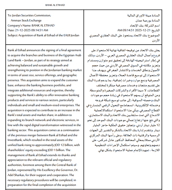 وقدّمت إدارة بنك الاتحاد شكرها للجهات الرسمية والرقابية، وعلى رأسها البنك المركزي الأردني، ومحافظ البنك الدكتور عادل شركس، على دعمهم وتعاونهم، مؤكدة استكمال الإجراءات التنظيمية اللازمة لإتمام عملية الاستحواذ بشكل نهائي.