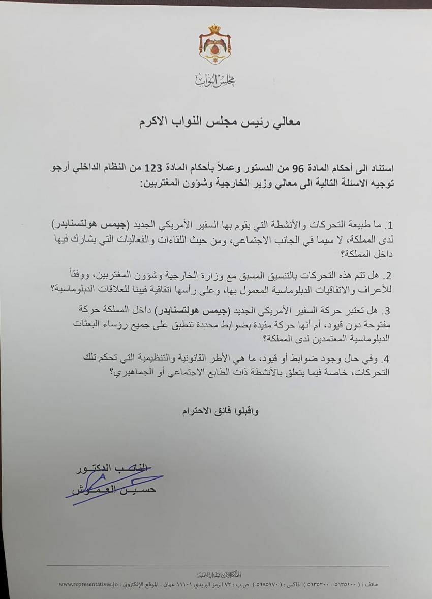 وجّه النائب الدكتور حسين العموش سؤالاً نيابياً إلى وزير الخارجية وشؤون المغتربين، عبر رئيس مجلس النواب، استناداً إلى أحكام المادة (96) من الدستور وعملاً بأحكام المادة (123) من النظام الداخلي لمجلس النواب، حول طبيعة تحركات وأنشطة السفير الأمريكي الجديد لدى المملكة، جيمس هولتسنايدر.