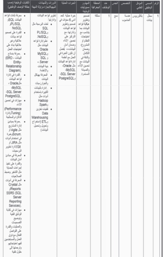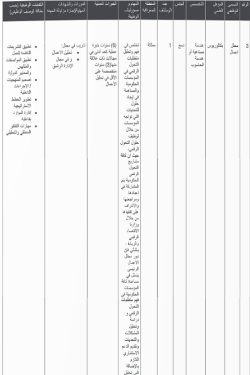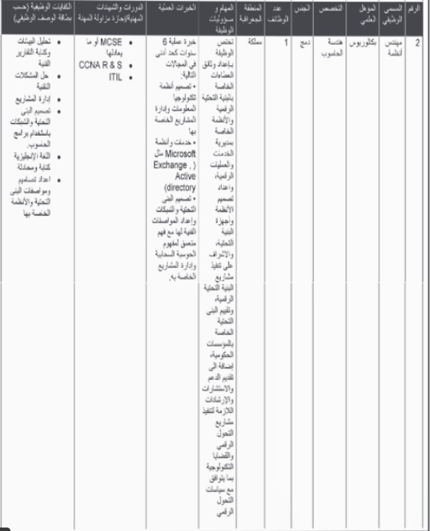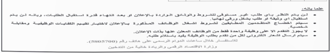 وأكدت الوزارة أن الإعلان يأتي ضمن احتياجاتها لتعبئة شواغر وظيفية في مجالات محددة، وبما ينسجم مع توجهاتها في تمكين الكفاءات الوطنية، ورفد القطاع الرقمي بخبرات قادرة على الإسهام في تنفيذ البرامج والمشاريع المرتبطة بالاقتصاد الرقمي والريادة.