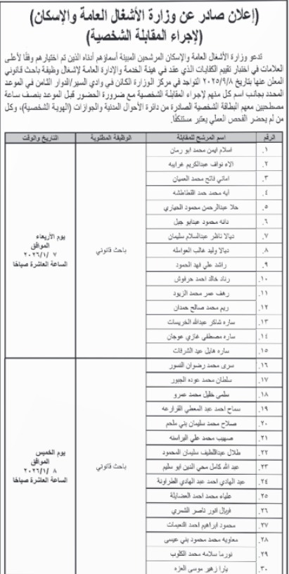 أعلنت وزارة الأشغال العامة والإسكان، اليوم الاثنين، عن دعوة عدد من المرشحين ممن انطبقت عليهم الشروط للمراجعة وإجراء المقابلات الشخصية، وذلك ضمن إجراءات التعيين المتبعة لديها لاستكمال تعبئة الشواغر المعلن عنها سابقًا.