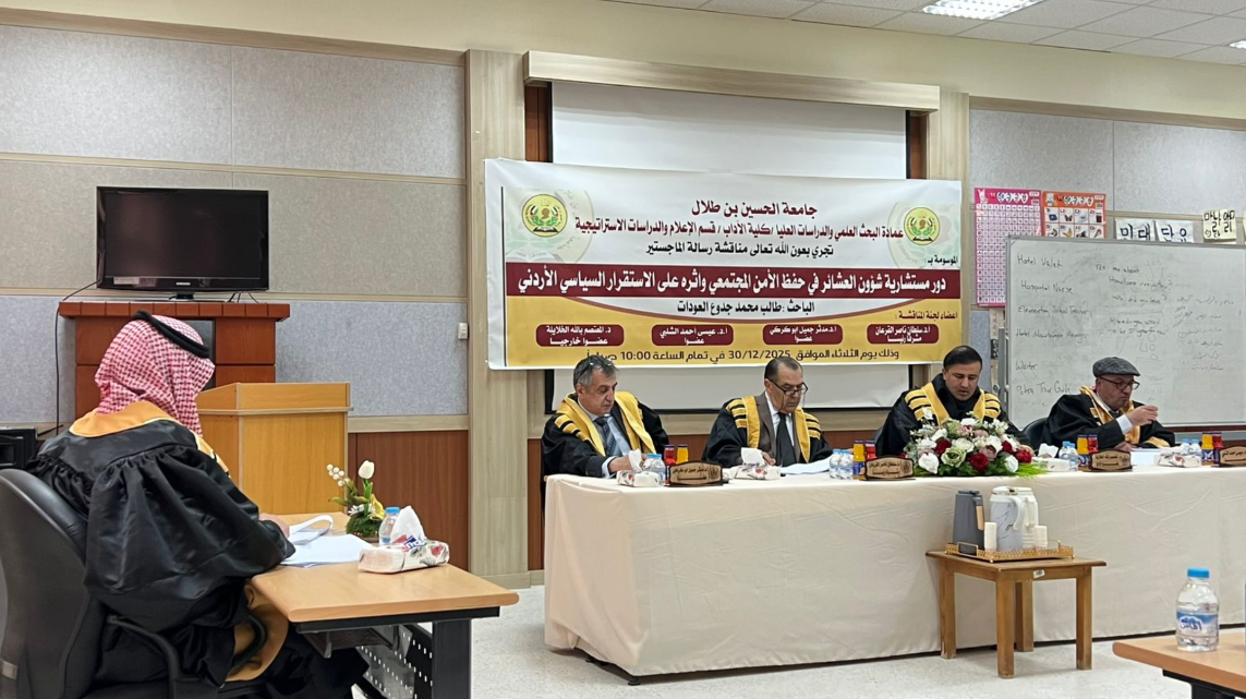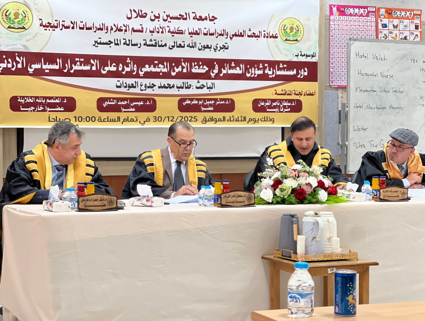 ناقش الشيخ والقاضي العشائري طالب محمد جدوع العودات الحويطات رسالة الماجستير في تخصص الدراسات الاستراتيجية،بدرجة الامتياز، والموسومة بعنوان:
