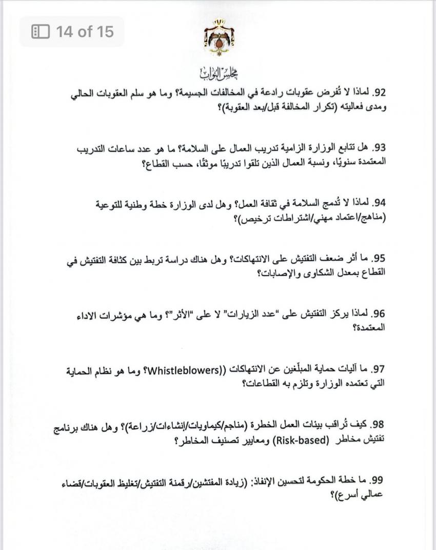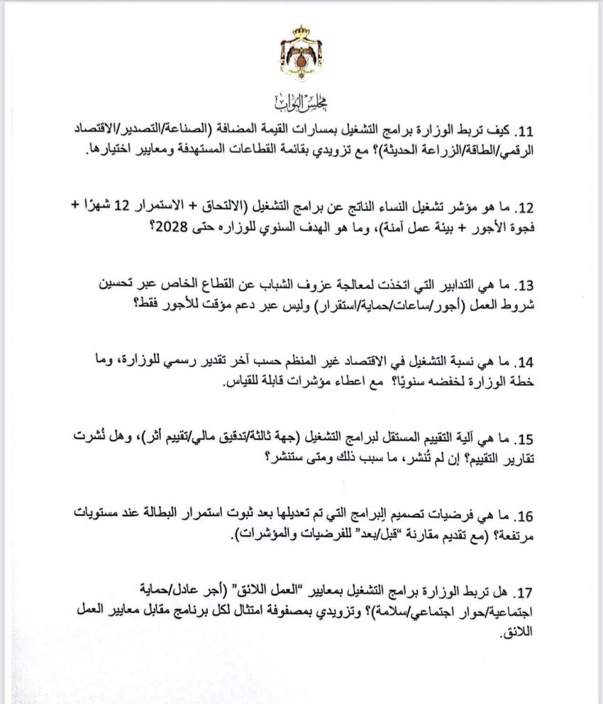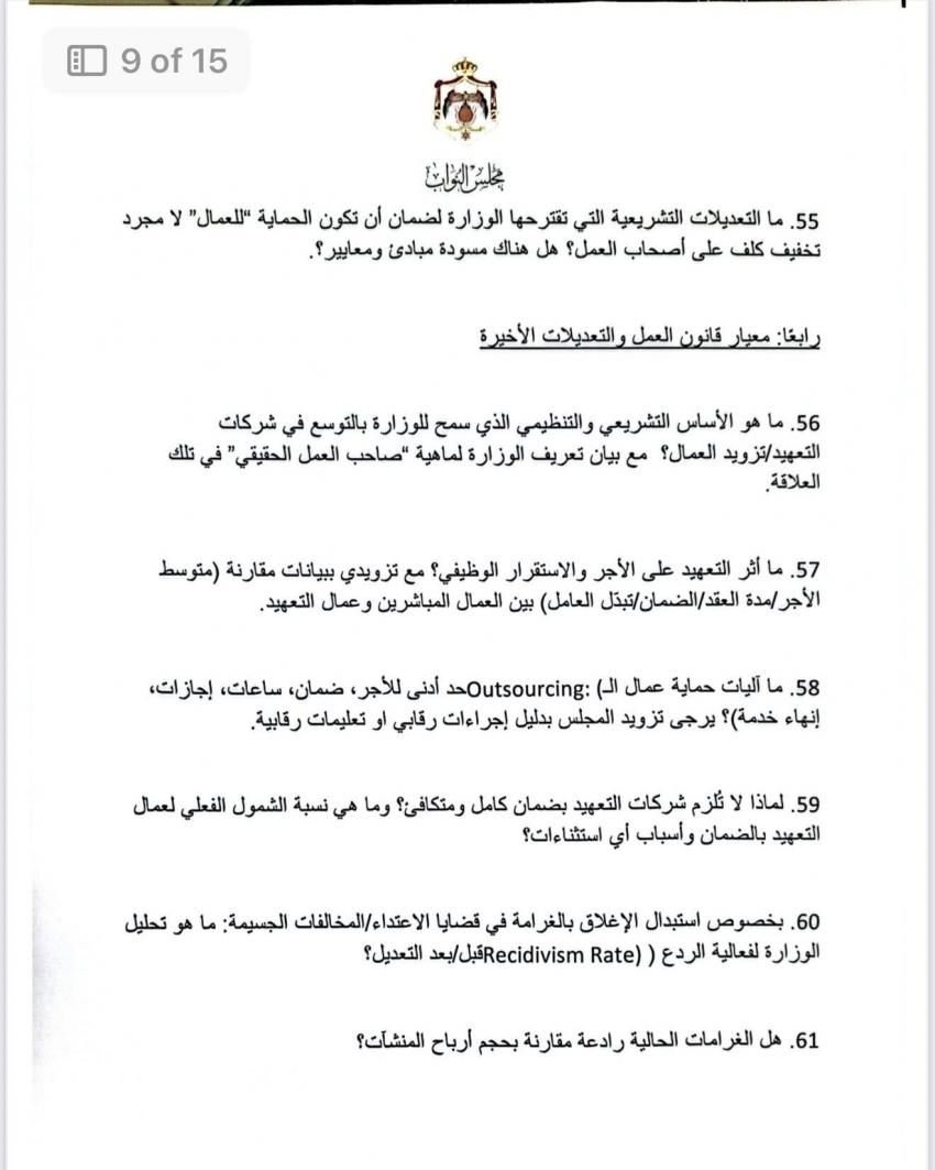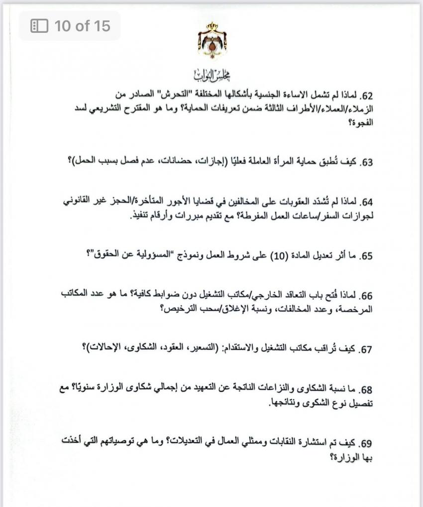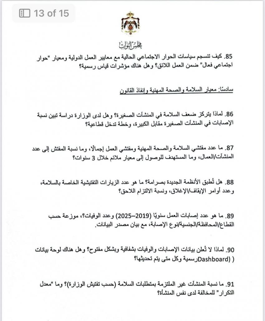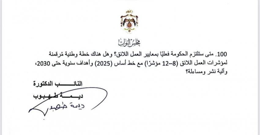 في أطول استجواب بتاريخ البرلمان، وجّهت النائب ديمة طهبوب 100 سؤال استجوابي إلى وزير العمل خالد البكار، حول مدى التزام الحكومة بتطبيق معايير العمل اللائق في المملكة، في خطوة رقابية وُصفت بأنها غير مسبوقة من حيث الحجم والمضمون.