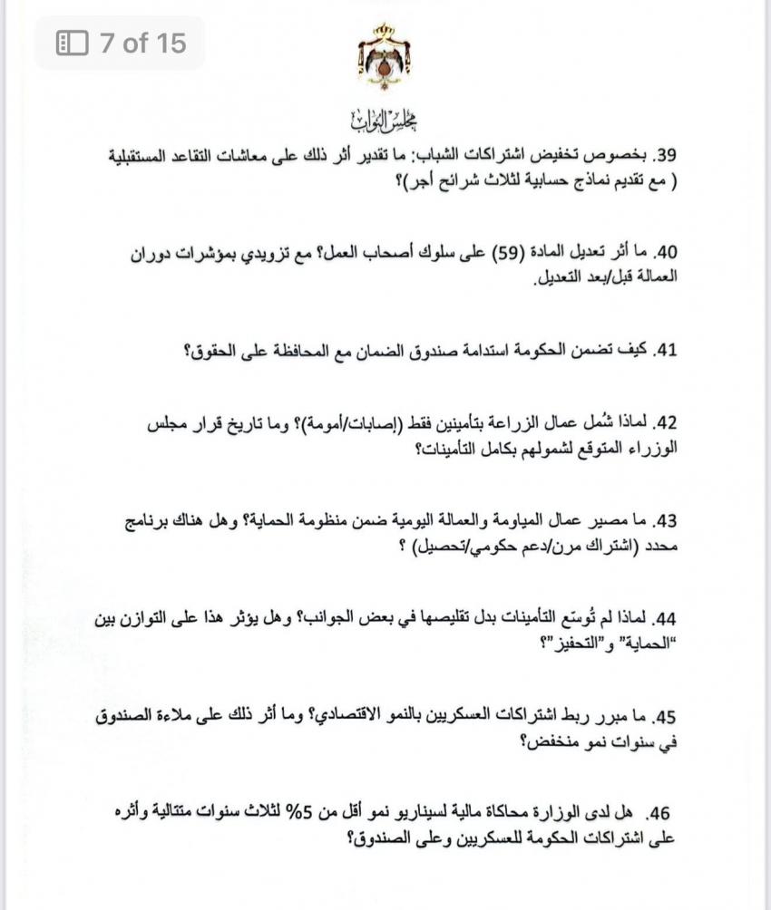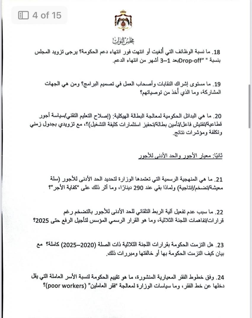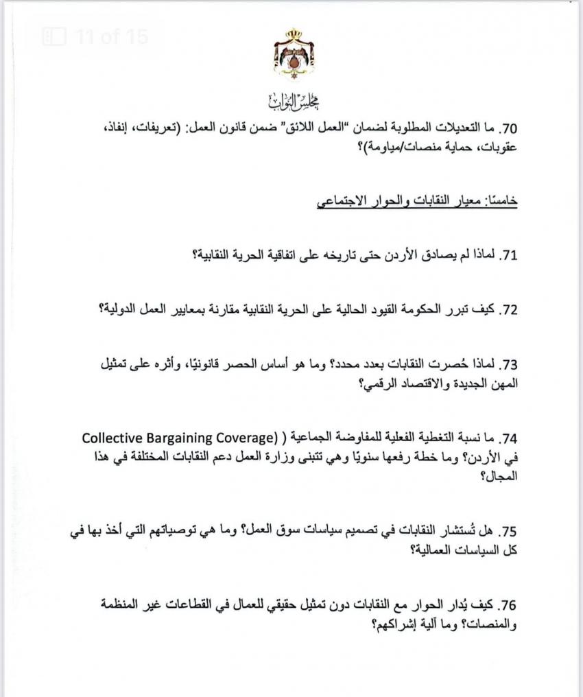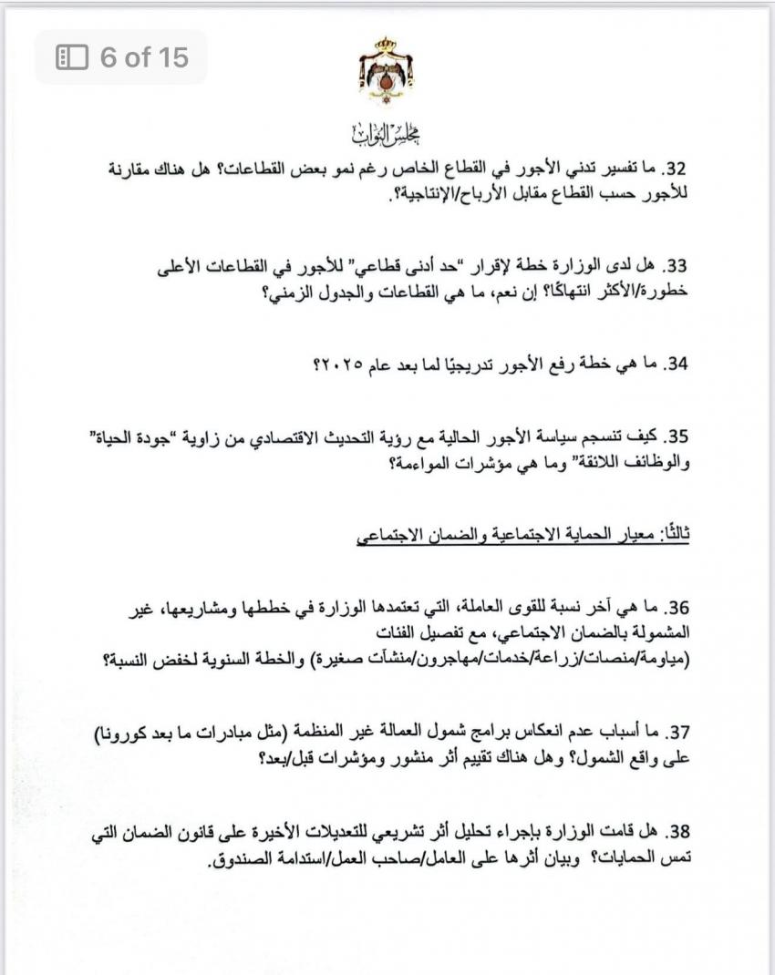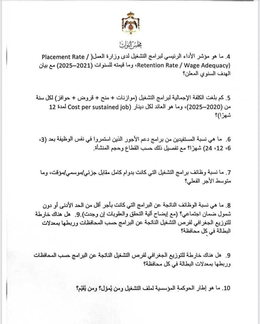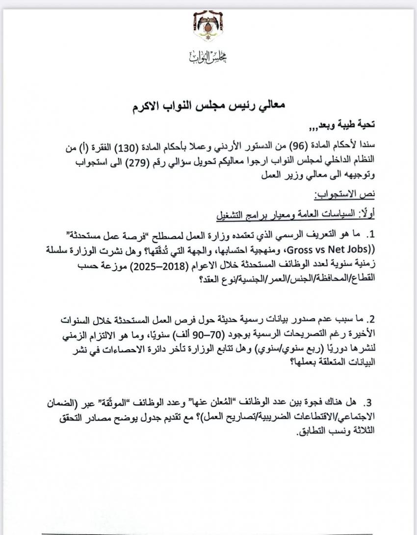 في أطول استجواب بتاريخ البرلمان، وجّهت النائب ديمة طهبوب 100 سؤال استجوابي إلى وزير العمل خالد البكار، حول مدى التزام الحكومة بتطبيق معايير العمل اللائق في المملكة، في خطوة رقابية وُصفت بأنها غير مسبوقة من حيث الحجم والمضمون.