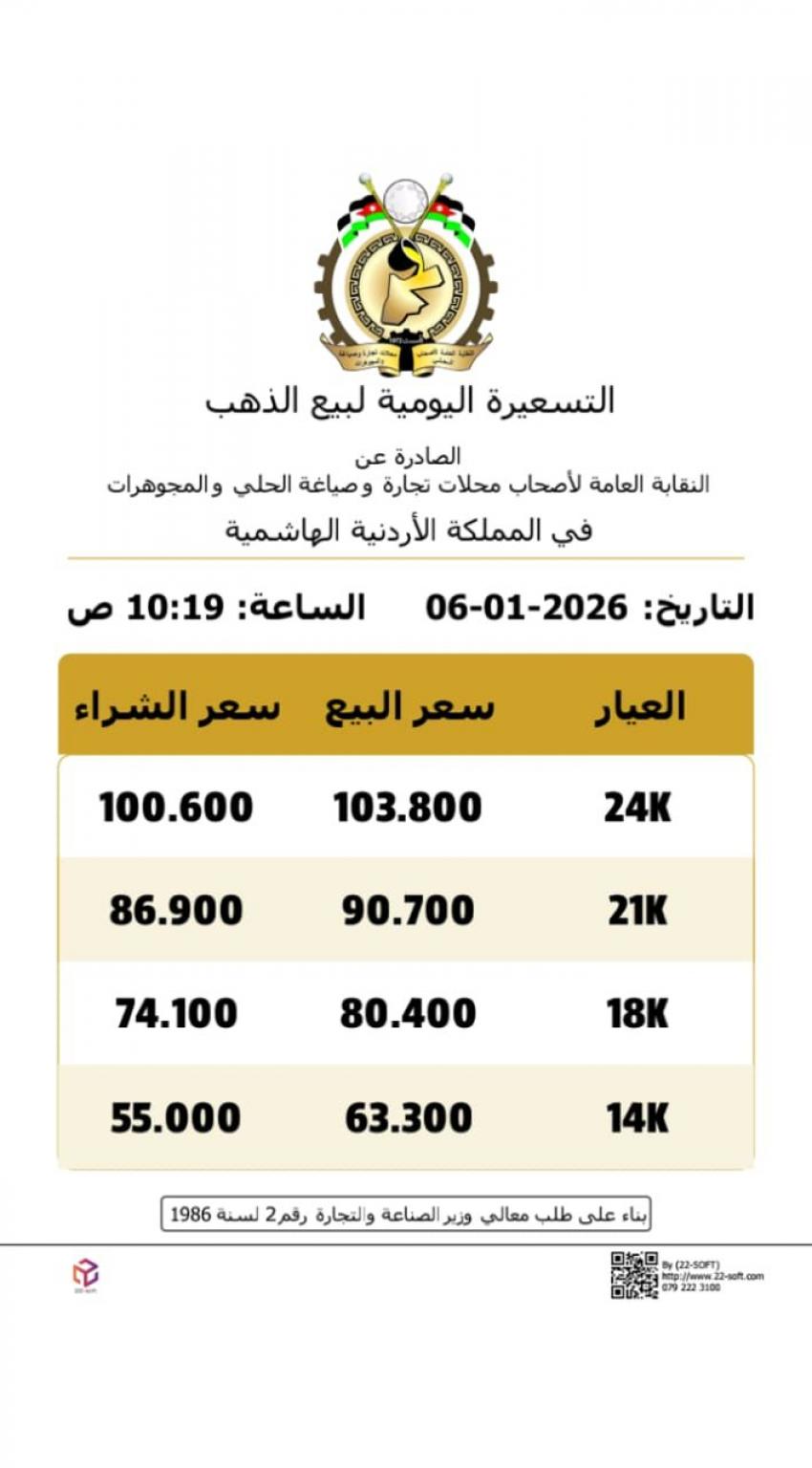 وبحسب التسعيرة، بلغ سعر بيع غرام الذهب عيار 21 في محالّ الصاغة 90.70 دينارًا، فيما وصل سعر الشراء إلى 86.90 دينارًا للغرام الواحد.