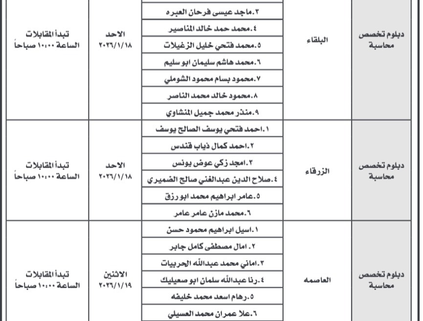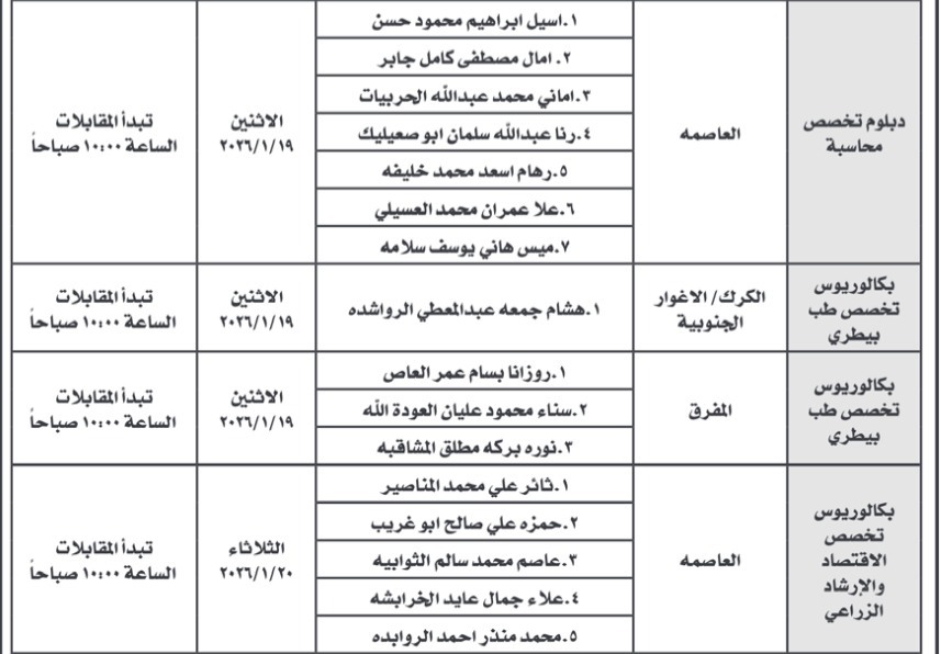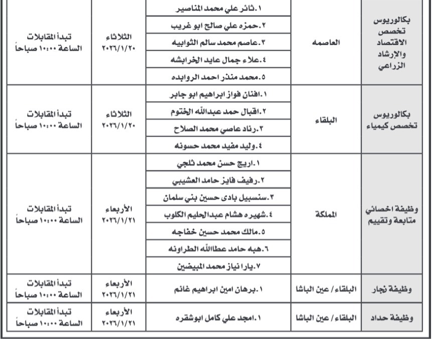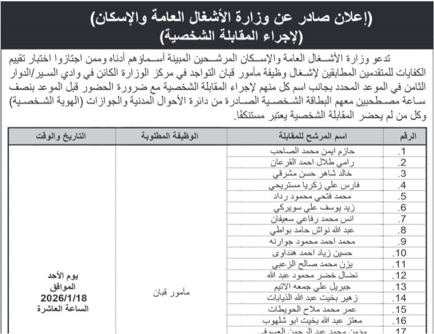 دعت دوائر حكومية، اليوم الأحد، مجموعة من المتقدمين الذين تم تحديد أسمائهم مسبقًا، إلى التقدّم لإجراء المقابلة الشخصية، وذلك في إطار استكمال إجراءات التعيين وفق الأسس المعتمدة.