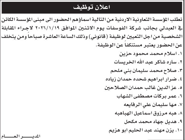 دعت المؤسسة التعاونية الاردنية اليوم الاثنين، التالية أسماؤهم لاجراء المقابلة الشخصية.