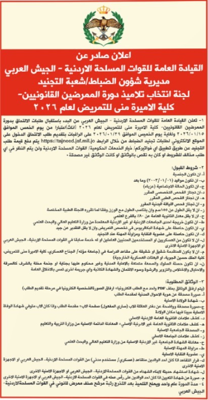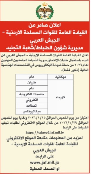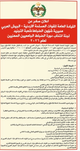 ودعت القيادة العامة الراغبين بالتقدم إلى الاطلاع على الشروط العامة والخاصة وآليات التقديم من خلال القنوات الرسمية للقوات المسلحة الأردنية، والتقيد بالمواعيد المحددة، مؤكدة أن القبول سيتم وفق أسس ومعايير دقيقة.