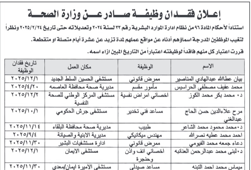 اتخذت وزارة الصحة قرارا حاسما بحق عدد من موظفيها بعد رصد تغيبهم عن مواقع عملهم لفترات تجاوزت الحد القانوني المسموح به.