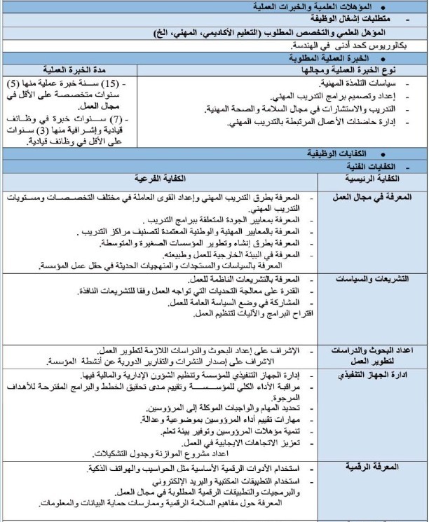 اعلنت رئاسة الوزراء عن توفر شاغر وظيفة مدير عام مؤسسة التدريب المهني، داعية الكفاءات المؤهلة ممن تنطبق عليهم شروط اشغال الوظيفة الى التقدم بطلباتهم عبر الموقع الالكتروني الرسمي.