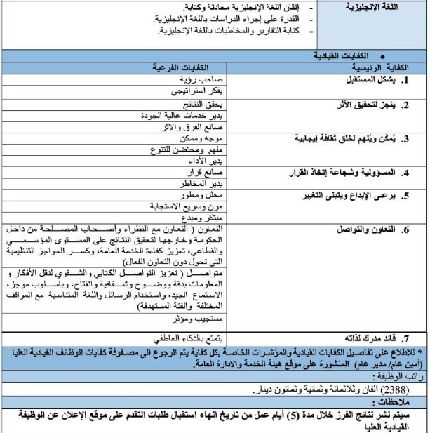وبينت ان تفاصيل وشروط اشغال الوظيفة، بما في ذلك المؤهلات العلمية والخبرات المطلوبة والمهام والمسؤوليات، متاحة للاطلاع عبر منصة التوظيف الحكومية، داعية الراغبين بالتقدم الى الالتزام بكافة الشروط والتعليمات المحددة.