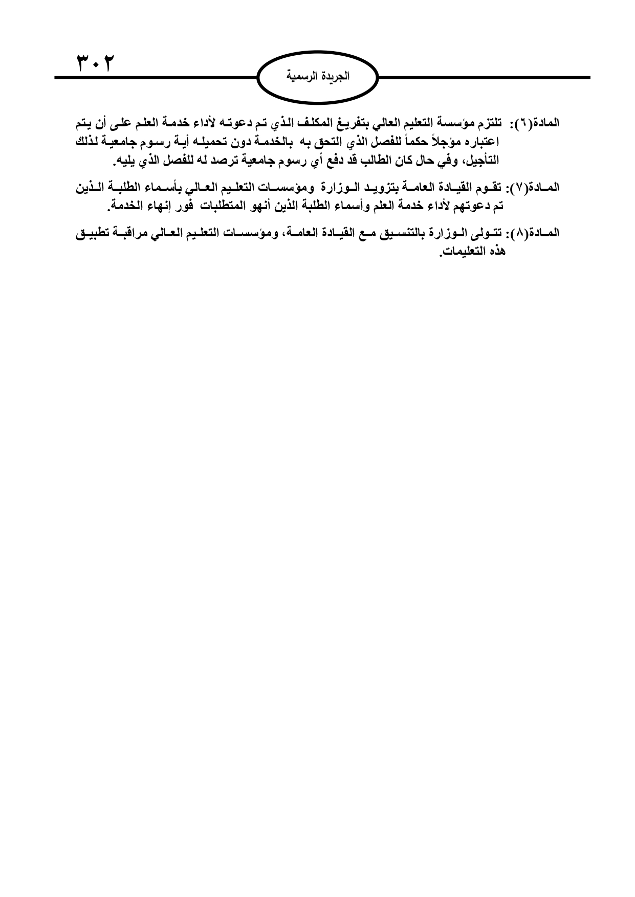 صدر في الجريدة الرسمية، الخميس، تعليمات احتساب المحاضرات والبرامج التدريبية لطلبة مؤسسات التعليم العالي ضمن خدمة العلم والخدمة الاحتياطية لسنة 2026.