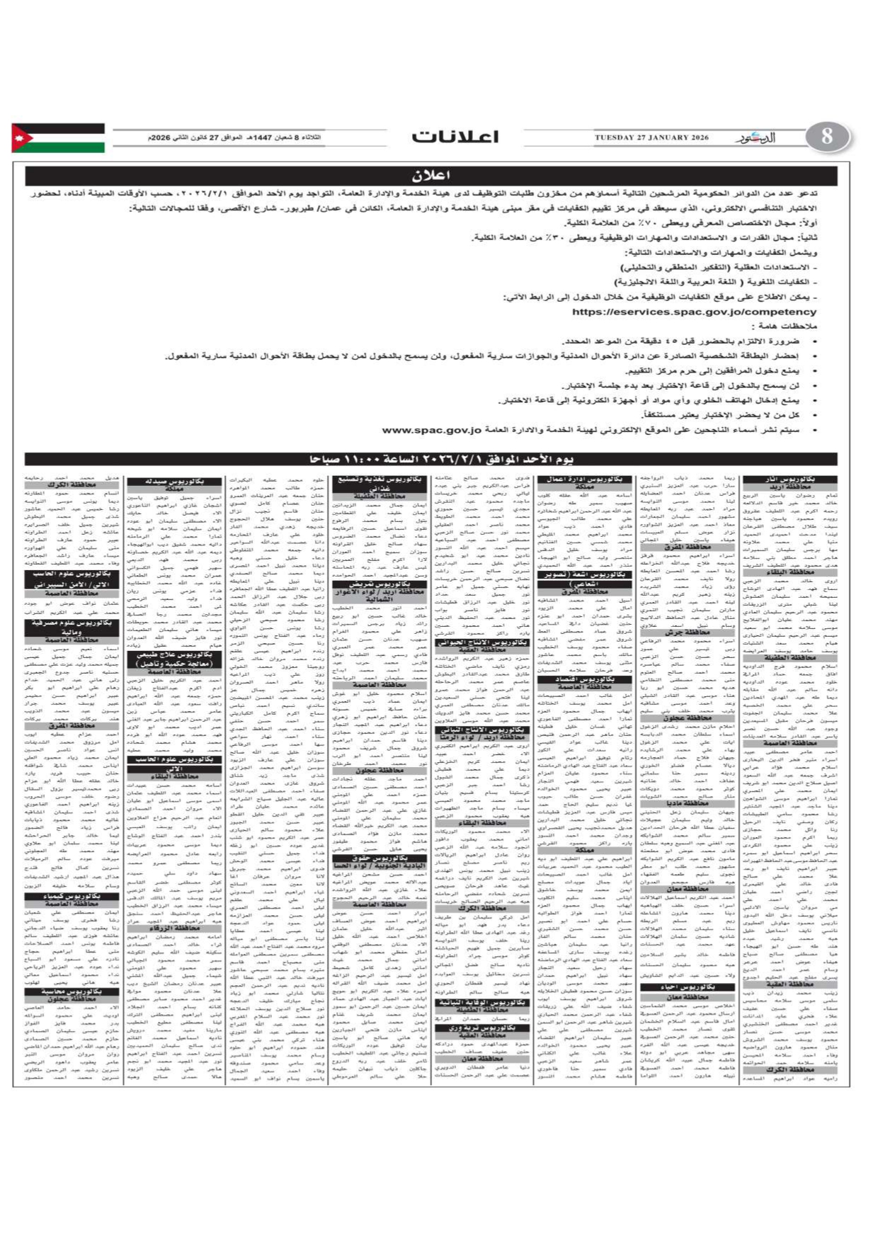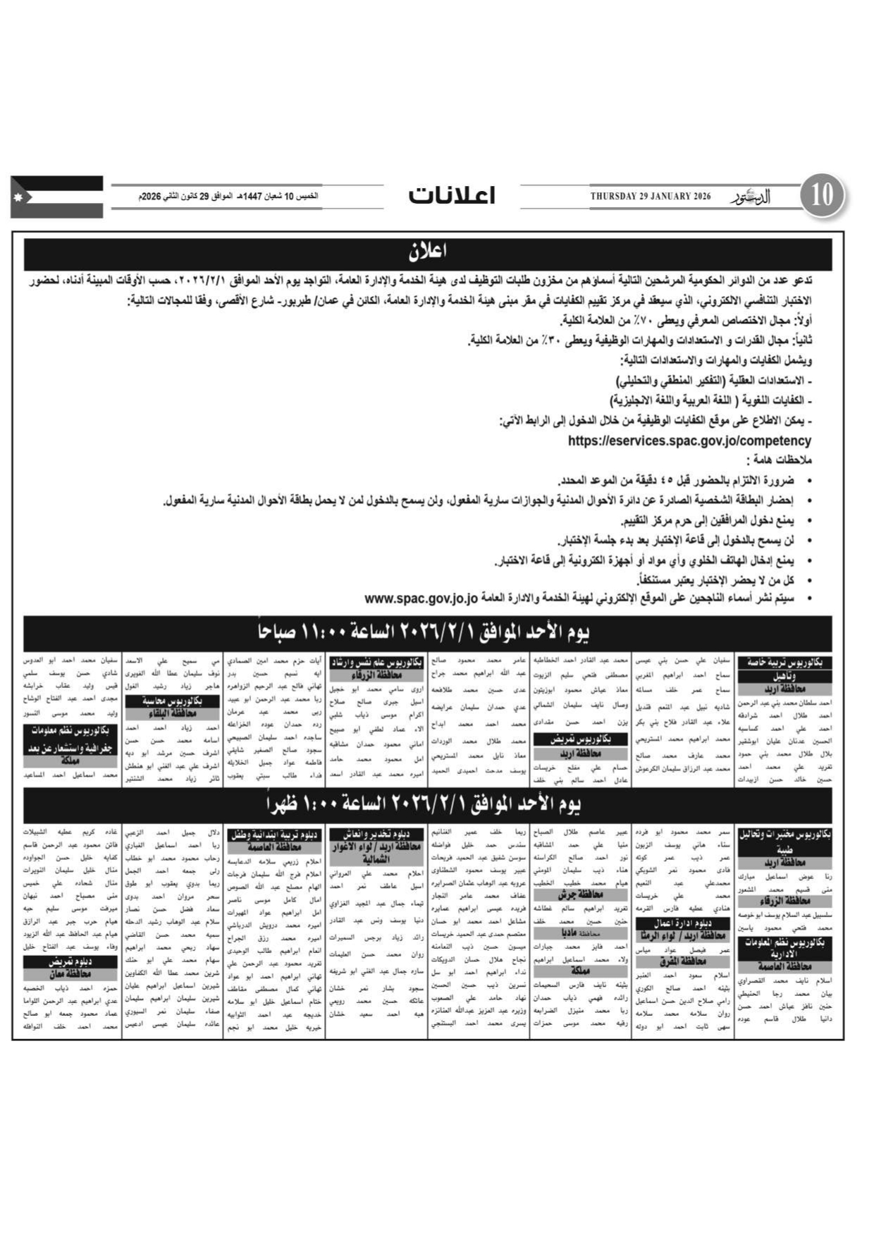 نشرت هيئة الخدمة والإدارة العامة اسماء المرشحين من مخزون طلبات التوظيف لدى الهيئة لحضور الاختبار التنافسي يوم الاحد الموافق 1/2/2026، وتاليا التفاصيل: