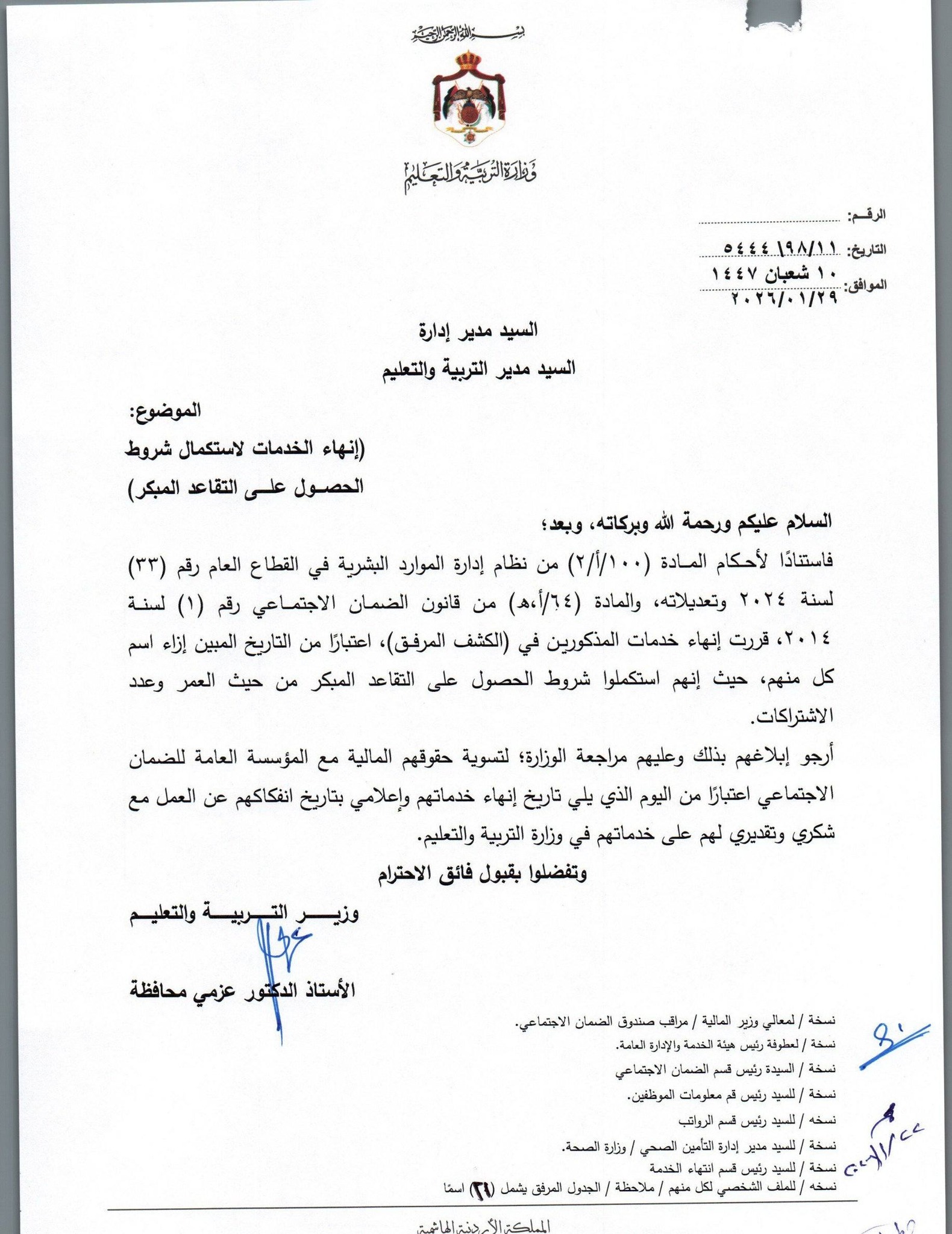 وافق وزير التربية والتعليم الدكتور عزمي محافظة على ترفيع عدد من موظفي مديريات التربية والتعليم الى الدرجات التي تلي درجاتهم الحالية، وذلك تمهيدا لاحالتهم الى التقاعد المبكر بعد استكمال جميع الشروط القانونية المعتمدة.