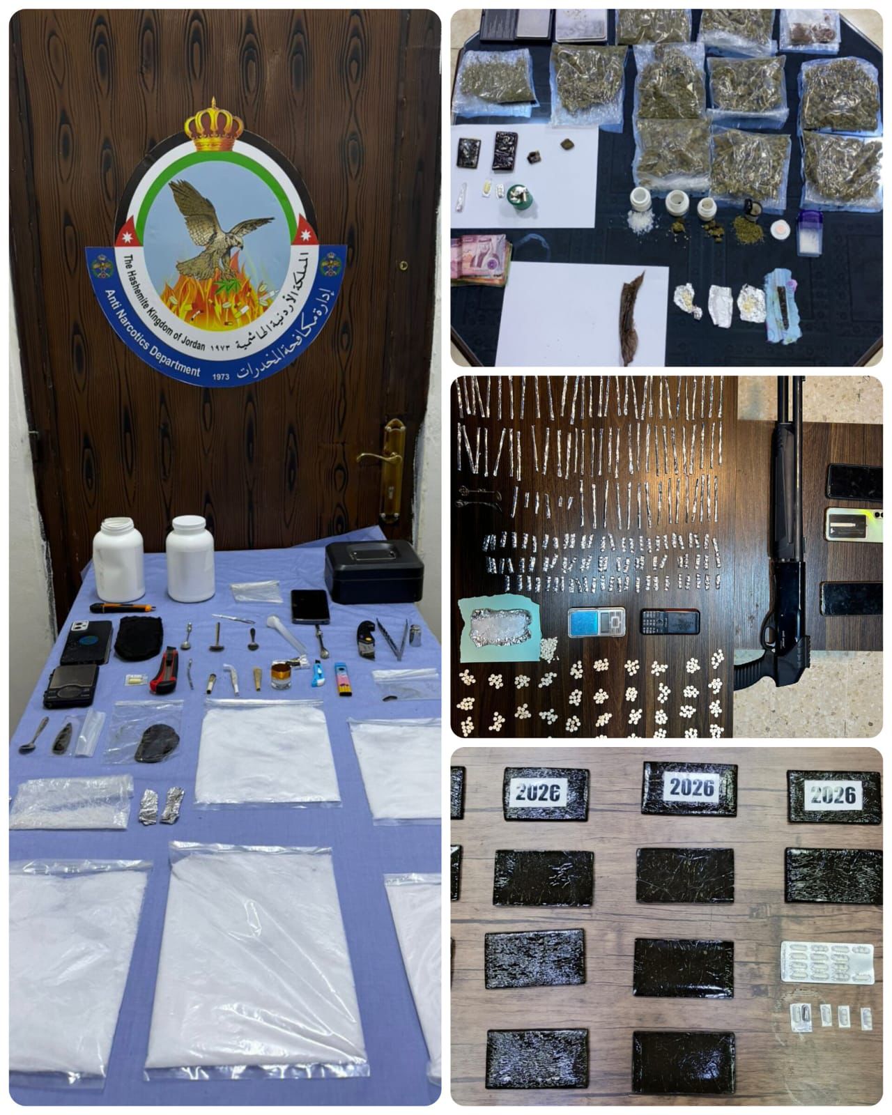 واضاف انه في القضية الثالثة تمت ملاحقة مركبة استخدمها ثلاثة مروجين والقي القبض عليهم وضبط بحوزتهم خمسة كفوف حشيش و500 حبة مخدرة وكمية من مادة الكريستال القاتلة وسلاح ناري، فيما ضبط في القضية الرابعة 1.250 كغم من مادة الكريستال بحوزة احد التجار.