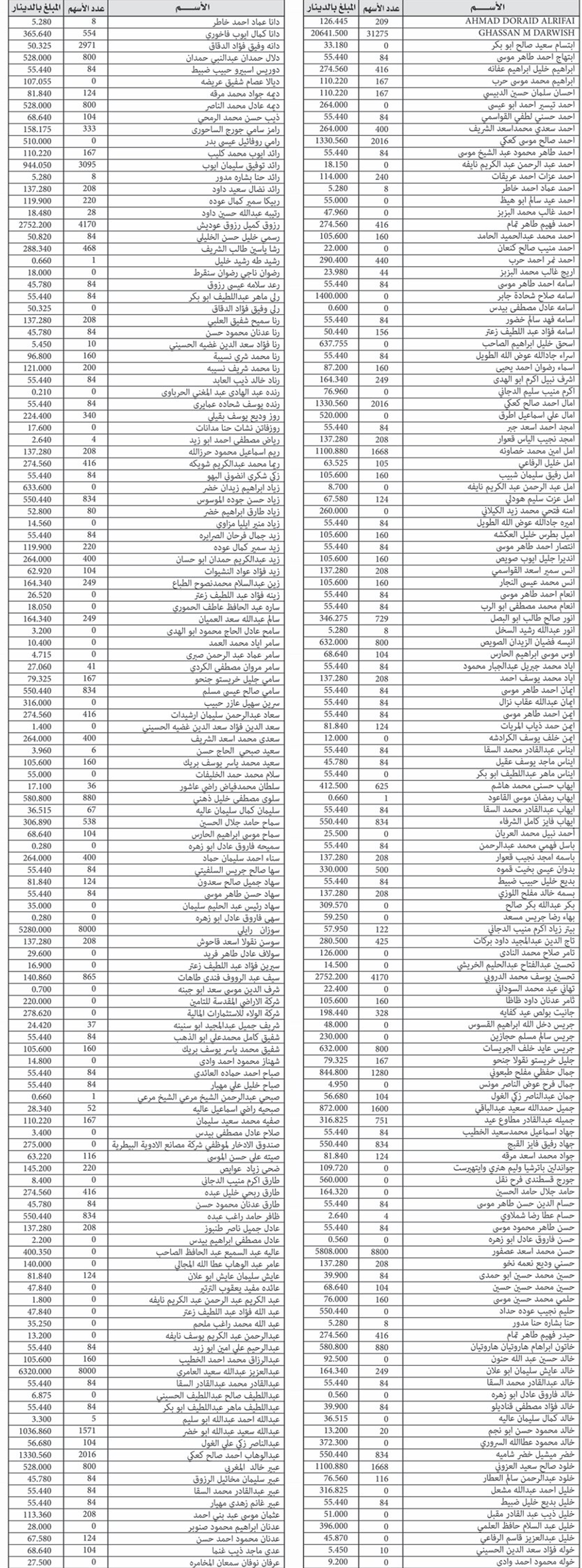 وانذرت الشركة بان التخلف عن مراجعتها ضمن المدة المحددة سيترتب عليه انتقال ملكية الاموال المذكورة، بما في ذلك الاسهم وارباحها، الى خزينة المملكة الاردنية الهاشمية، استنادا لاحكام قانون تملك الحكومة للاموال التي يلحقها التقادم.