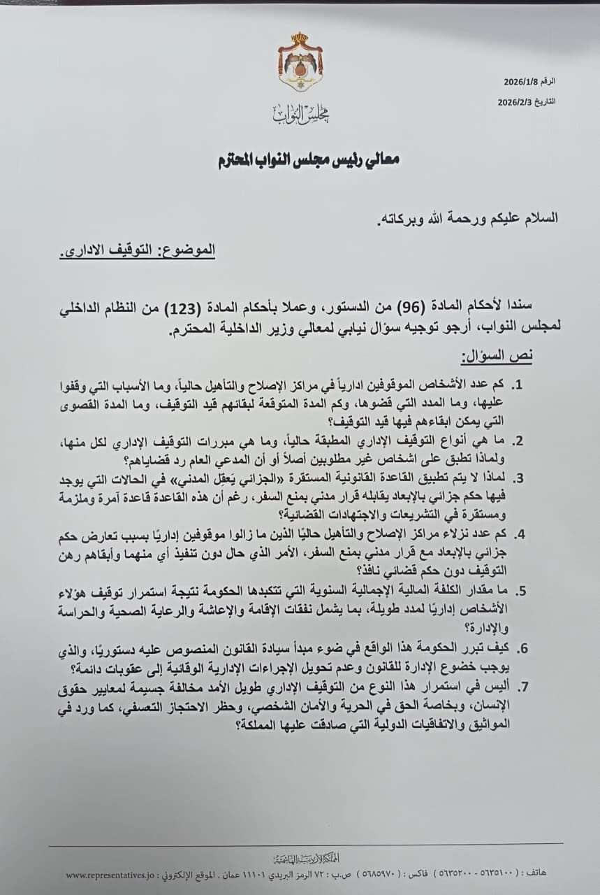 وقالت المحسيري ان سؤالها استند لاحكام المادة 96 من الدستور والمادة 123 من النظام الداخلي لمجلس النواب، مطالبة الحكومة بالكشف عن العدد الحقيقي للموقوفين اداريا في مراكز الاصلاح والتاهيل، واسباب توقيفهم، ومدد بقائهم قيد التوقيف، والحد الاعلى المسموح به قانونا.