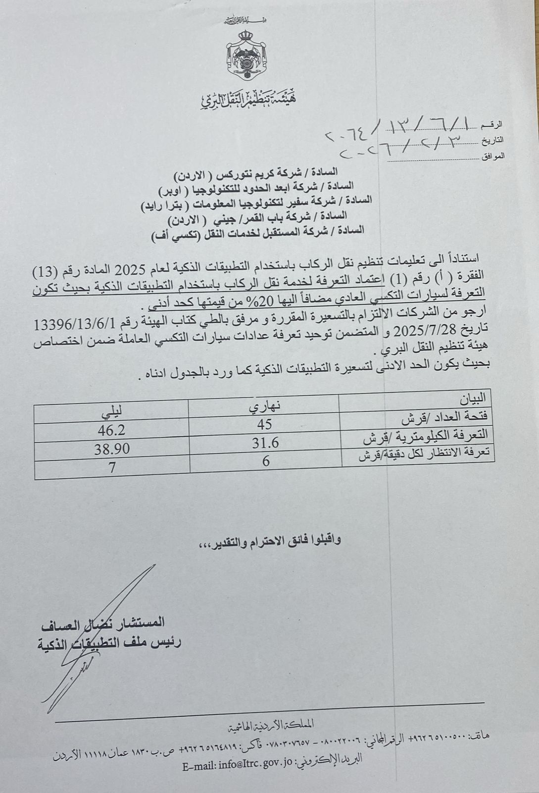 اصدرت هيئة تنظيم النقل البري تعميما رسميا اقر اعتماد حد ادنى جديد لتعرفات نقل الركاب باستخدام التطبيقات الذكية، وذلك استنادا لتعليمات تنظيم نقل الركاب باستخدام التطبيقات الذكية لعام 2025.