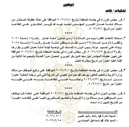 قرر مجلس الوزراء إقرار ترفيعات لموظفين في عدد من الوزارات والدوائر والمؤسسات الرسمية، إلى جانب إحالة عدد من الموظفين إلى التقاعد، وذلك ضمن قراراته الإدارية والتنظيمية.
