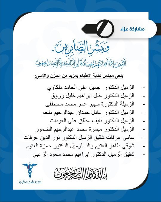 نعت نقابة الأطباء الأردنية، اليوم، عدداً من زملائها أعضاء الهيئة الطبية، معبرة عن بالغ الحزن والأسى لفقدانهم، ومتوجهة بأحر التعازي إلى ذويهم وأسرهم، داعية الله أن يتغمدهم بواسع رحمته ويدخلهم فسيح جناته.