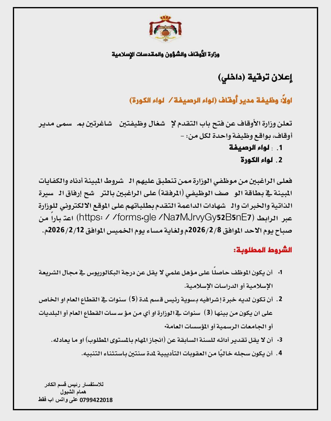 أعلنت وزارة الأوقاف عن فتح باب التقدم لشغل عدد من الوظائف الشاغرة بمسميات: مدير أوقاف، مساعد الأمين العام، ومدير الشؤون المالية، بواقع وظيفة واحدة لكل منصب.