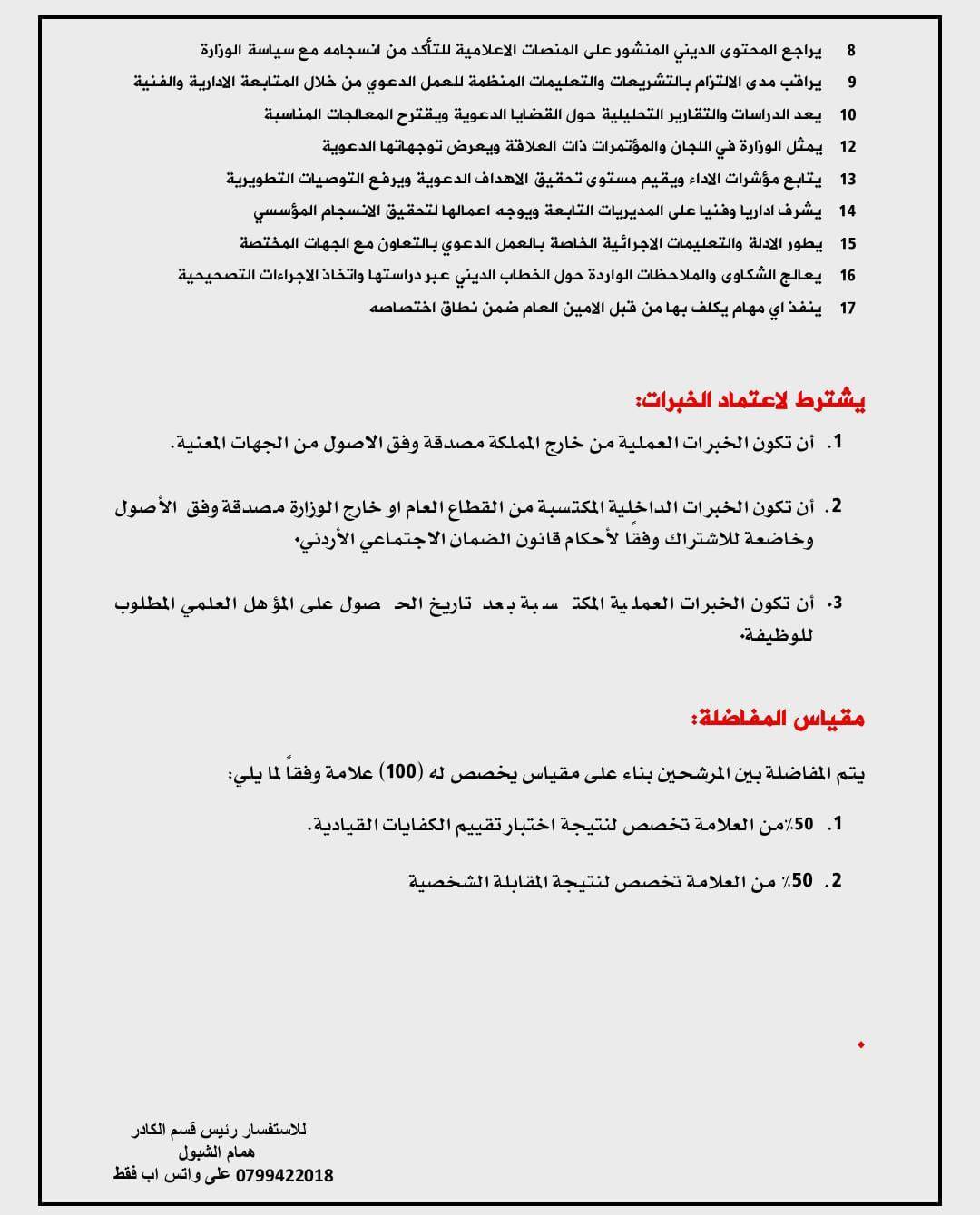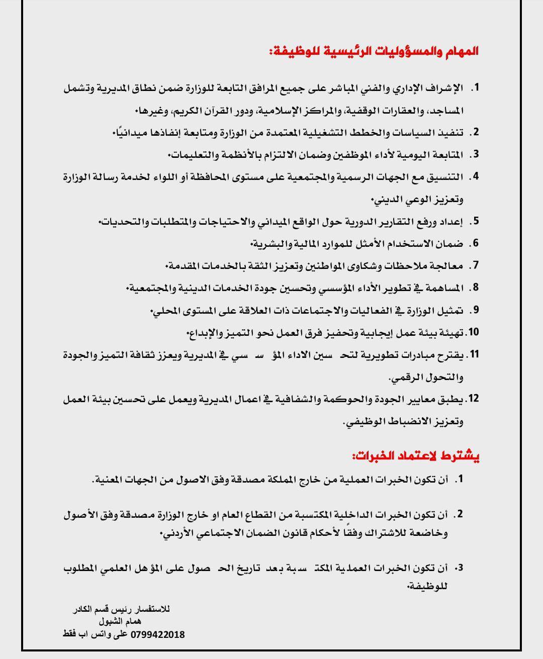 وتشمل الوظائف الشاغرة: مدير أوقاف الرصيفة والكورة، مساعد الأمين العام لشؤون الدعوة والتوجيه الإسلامي، مساعد الأمين العام للشؤون الإدارية والقانونية، ومدير الشؤون المالية.