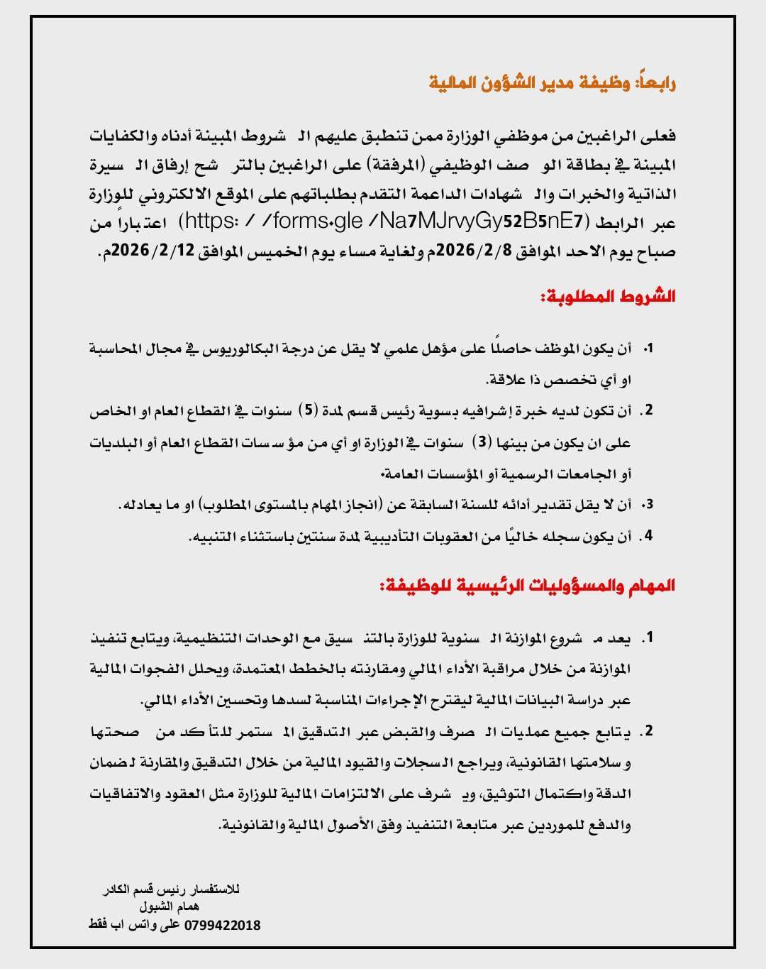 ودعت الوزارة الراغبين من موظفيها ممن تنطبق عليهم الشروط والكفايات الوظيفية المذكورة في بطاقة الوصف الوظيفي المرفقة، إلى تقديم طلباتهم عبر الموقع الالكتروني للوزارة، مرفقين بالسيرة الذاتية والخبرات والشهادات الداعمة.