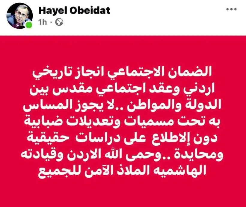 وقال عبيدات في منشور عبر صفحته على فيسبوك إن أي تعديل يمس منظومة الضمان يجب أن يستند إلى أسس علمية واضحة وشفافة، مؤكدا أن الحفاظ على هذا المنجز الوطني مسؤولية جماعية، وختم تصريحه بالدعاء بأن يحفظ الله الأردن وقيادته الهاشمية باعتبارها الملاذ الآمن للجميع.